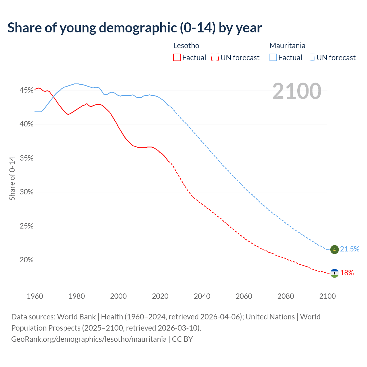 - The share of young demographic (0-15 years old) in Lesotho is 34.5% vs 42.7% in Mauritania.