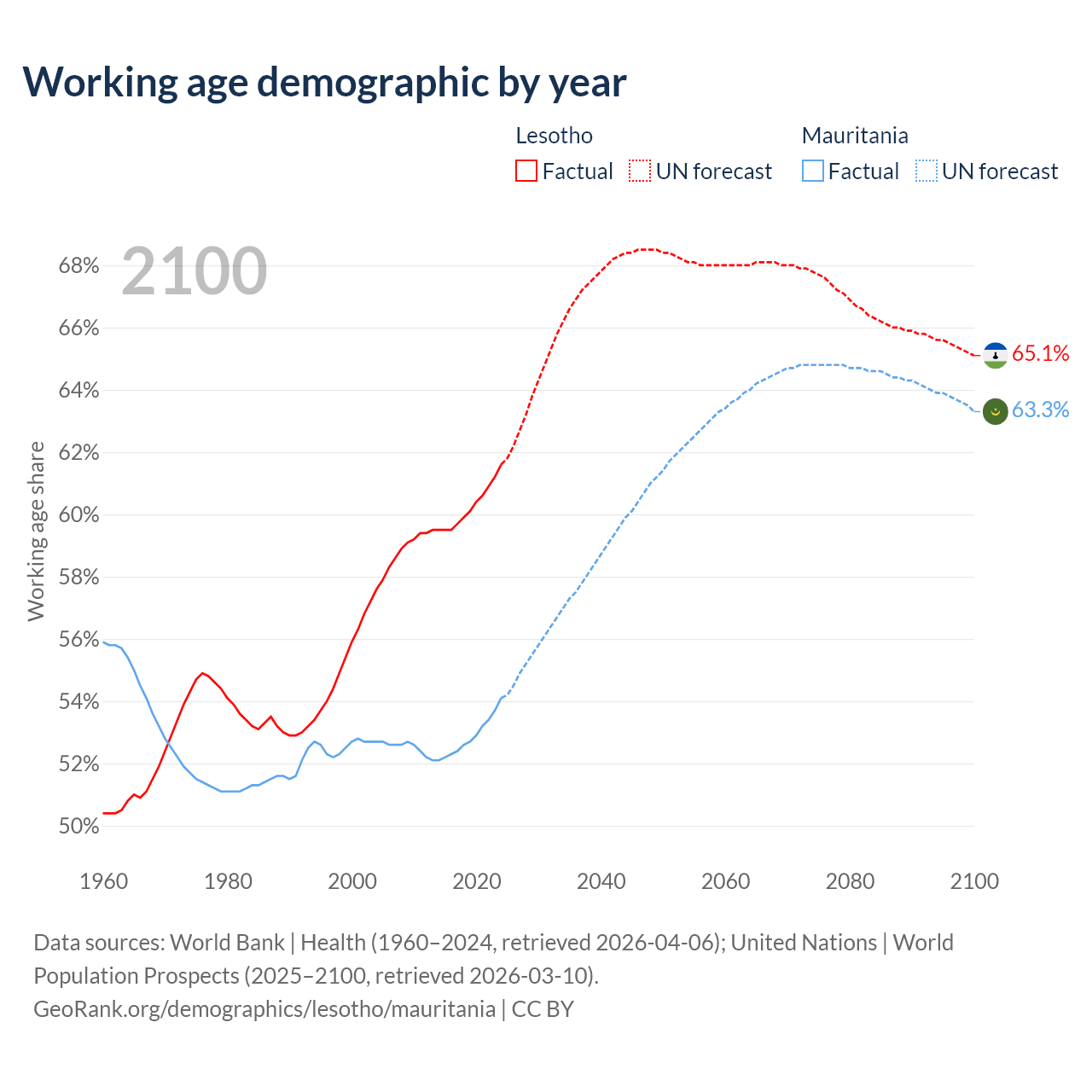 - Lesotho has 1.48M working age adults (aged 15-64) vs 2.98M in Mauritania.