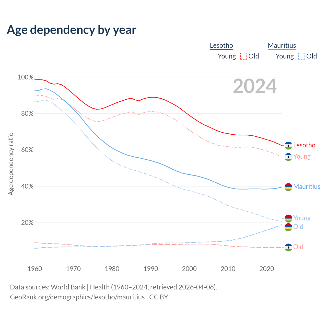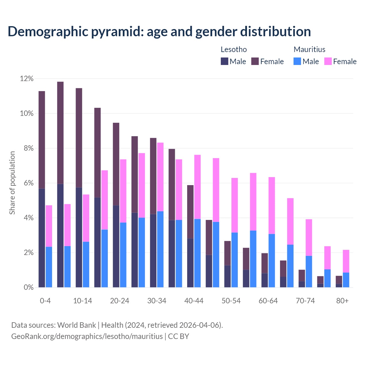 - Lesotho is ranked 143/196 by median age (oldest to youngest) vs 57/196 for Mauritius.