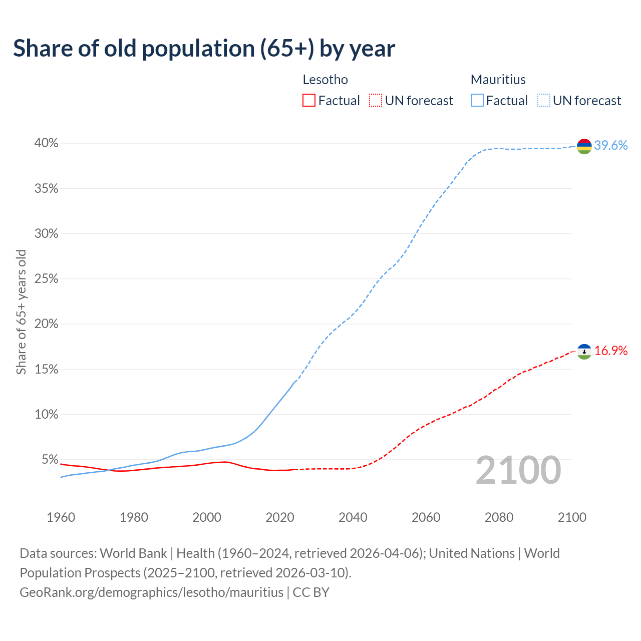 The share of older people aged 65 and over is 3.86% in Lesotho and 13.5% in Mauritius. Life expectancy in Lesotho compared to Mauritius .