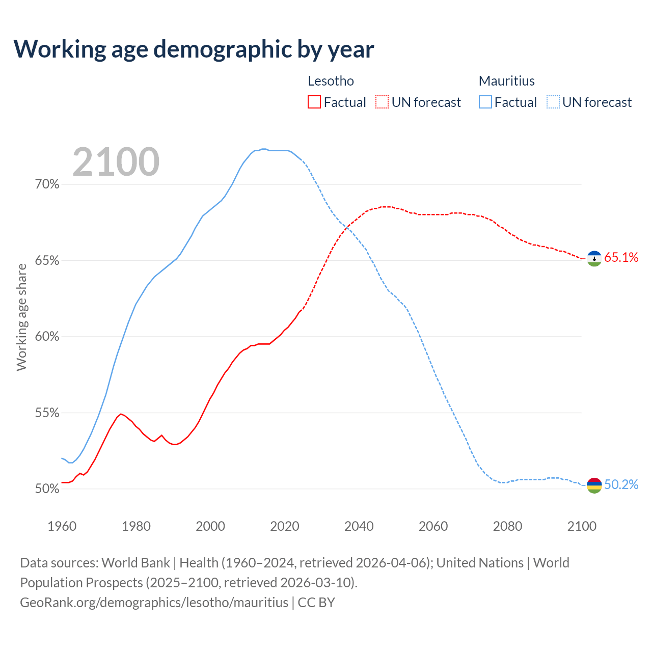 - Lesotho has 1.48M working age adults (aged 15-64) vs 889K in Mauritius.