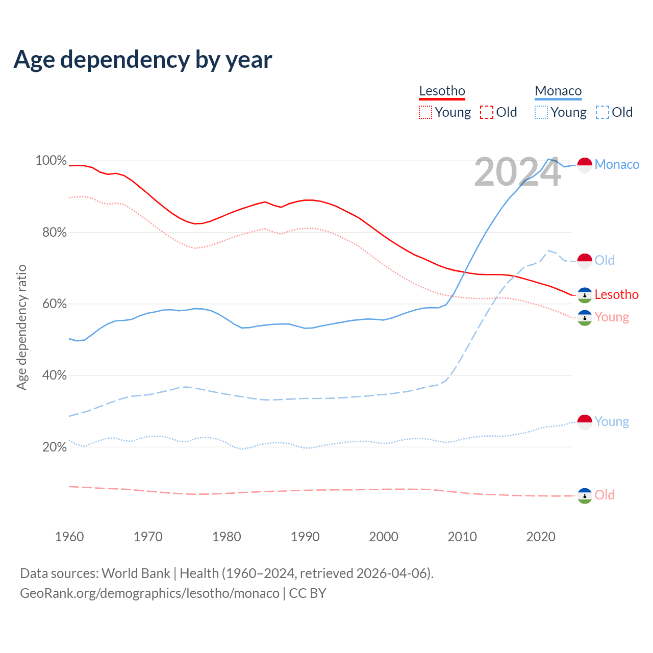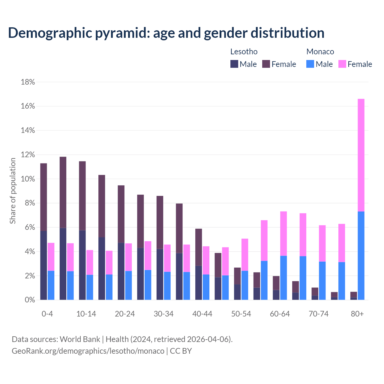 - Lesotho is ranked 143/196 by median age (oldest to youngest) vs 1/196 for Monaco.
