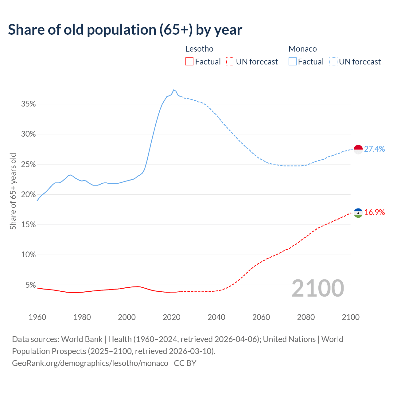 - The share of old-age demographic (65+) in Lesotho is 3.86% vs 36.2% in Monaco.