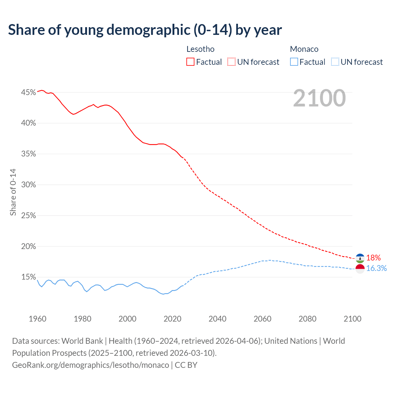 - The share of young demographic (0-15 years old) in Lesotho is 34.5% vs 13.5% in Monaco.