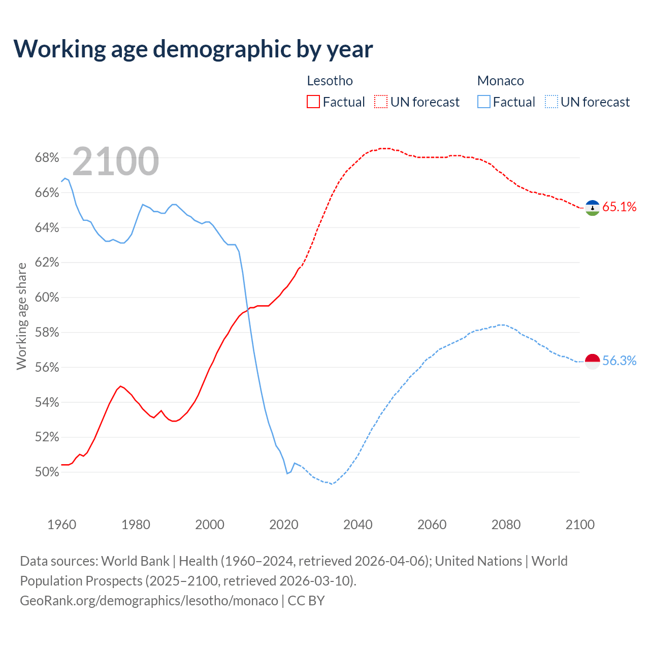 - Lesotho has 1.48M working age adults (aged 15-64) vs 19.2K in Monaco.