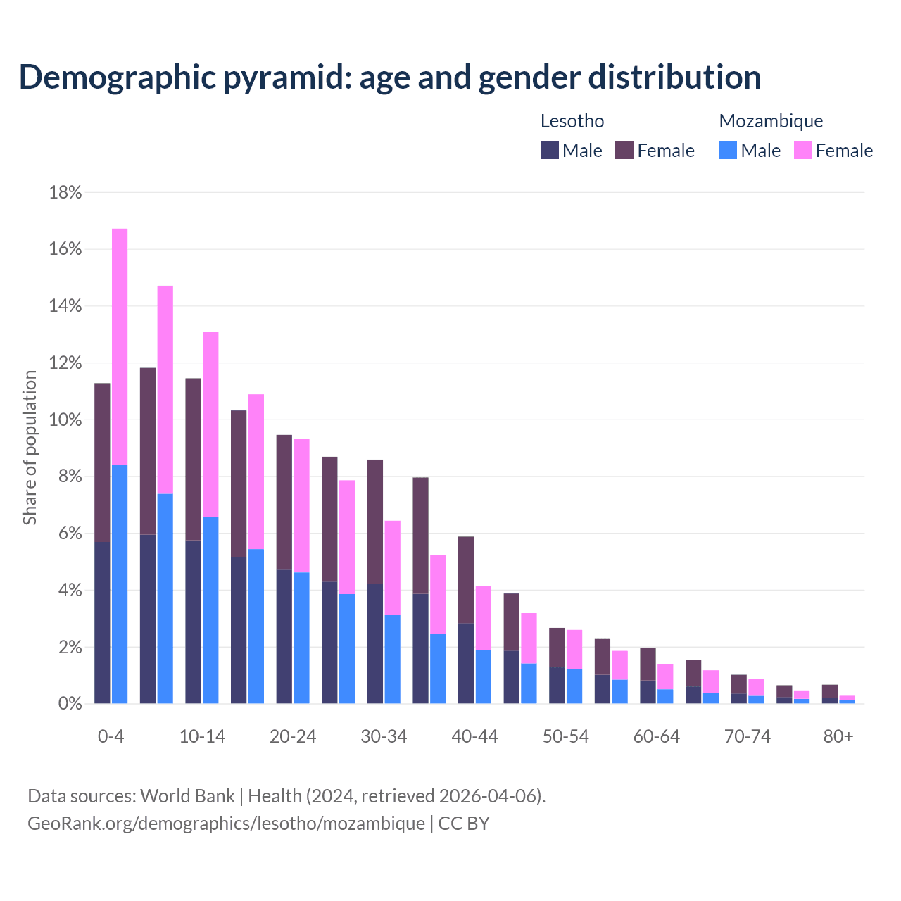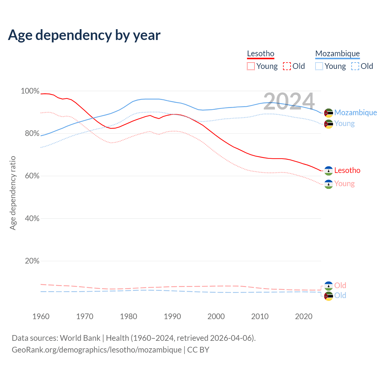 - The share of old-age demographic (65+) in Lesotho is 3.86% vs 2.75% in Mozambique.