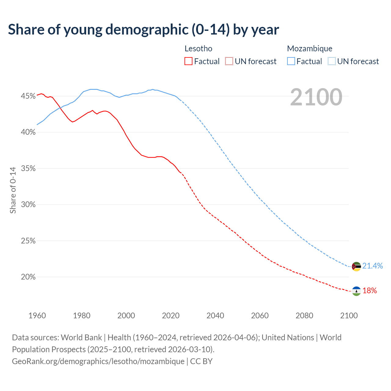 Median age Lesotho vs Mozambique, 1960-2100