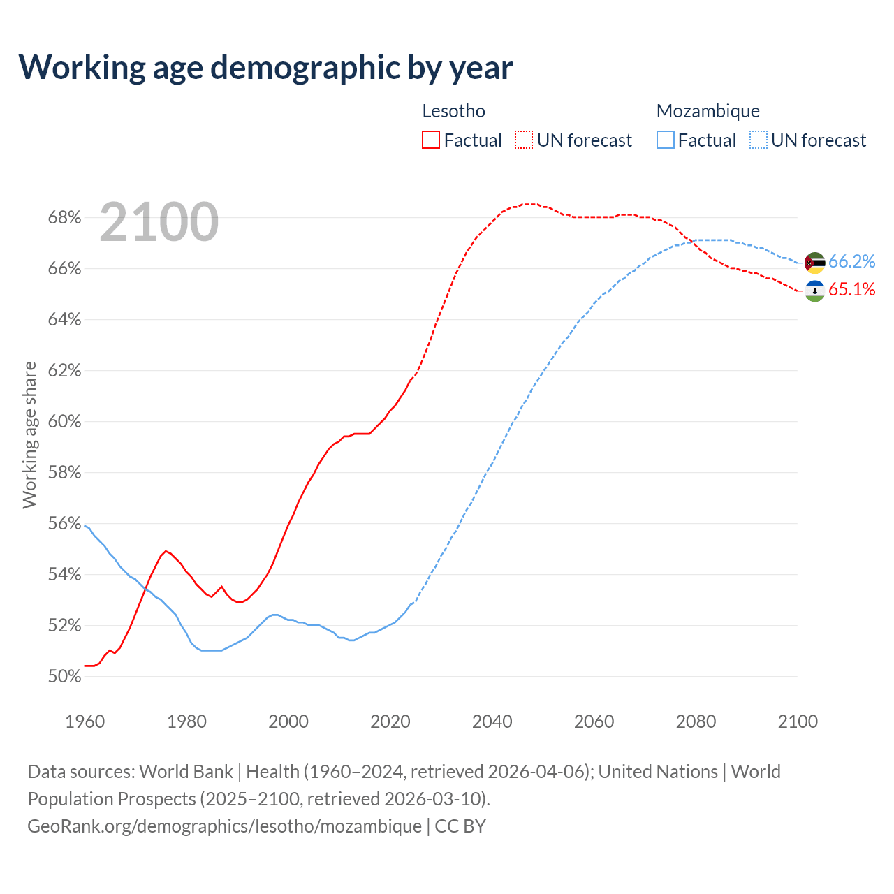The share of older people aged 65 and over is 3.86% in Lesotho and 2.75% in Mozambique. Life expectancy in Lesotho compared to Mozambique .