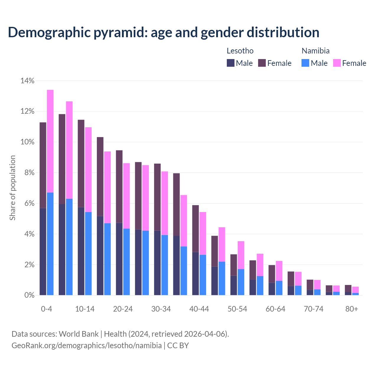 - Lesotho is ranked 143/196 by median age (oldest to youngest) vs 147/196 for Namibia.