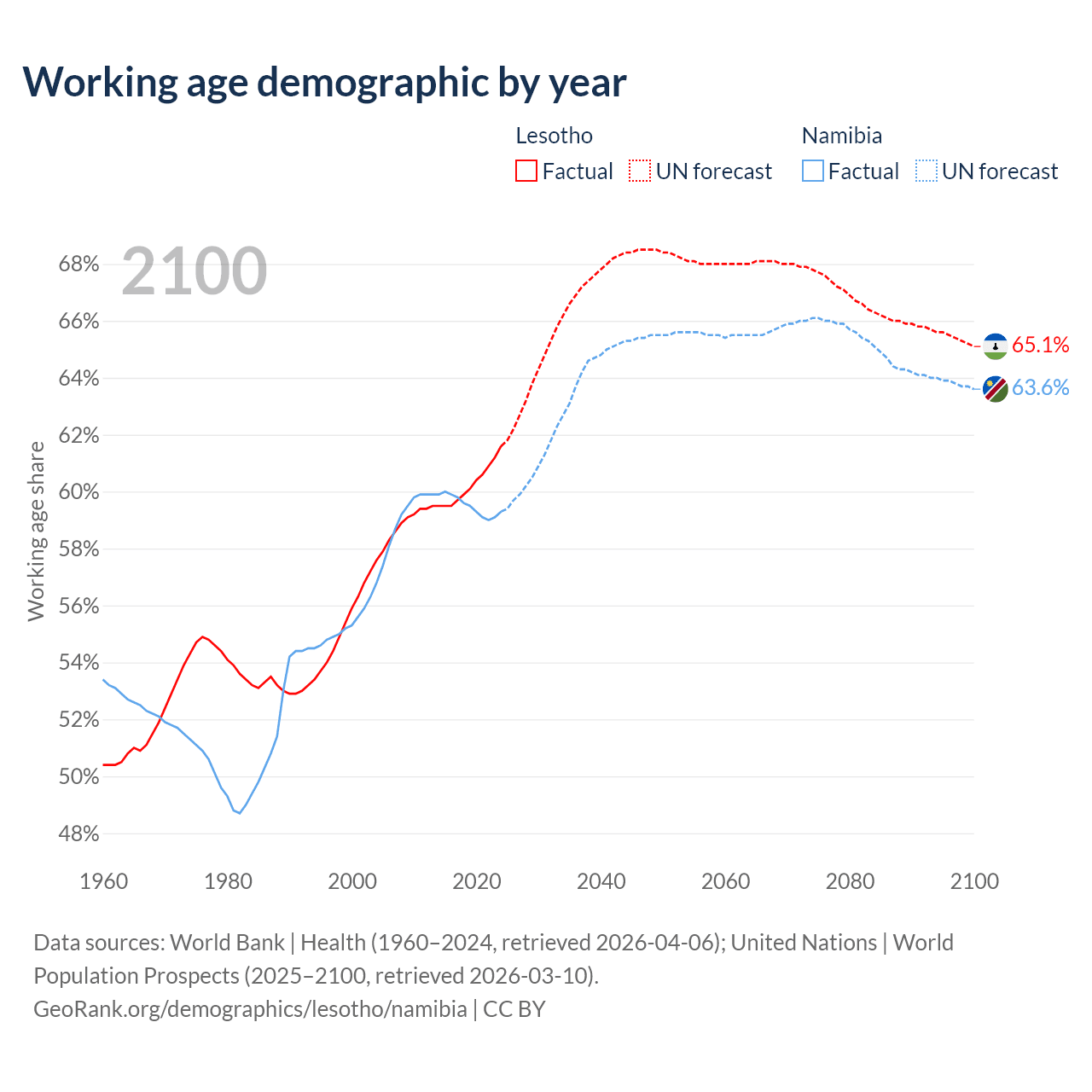 - Lesotho has 1.48M working age adults (aged 15-64) vs 1.88M in Namibia.