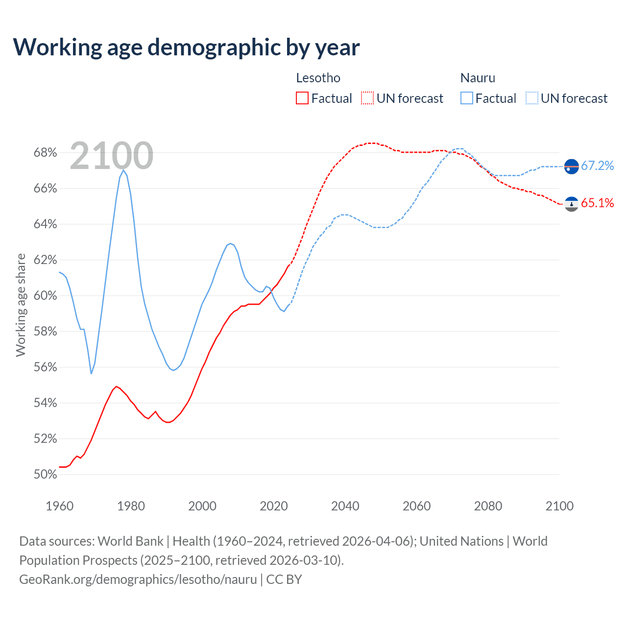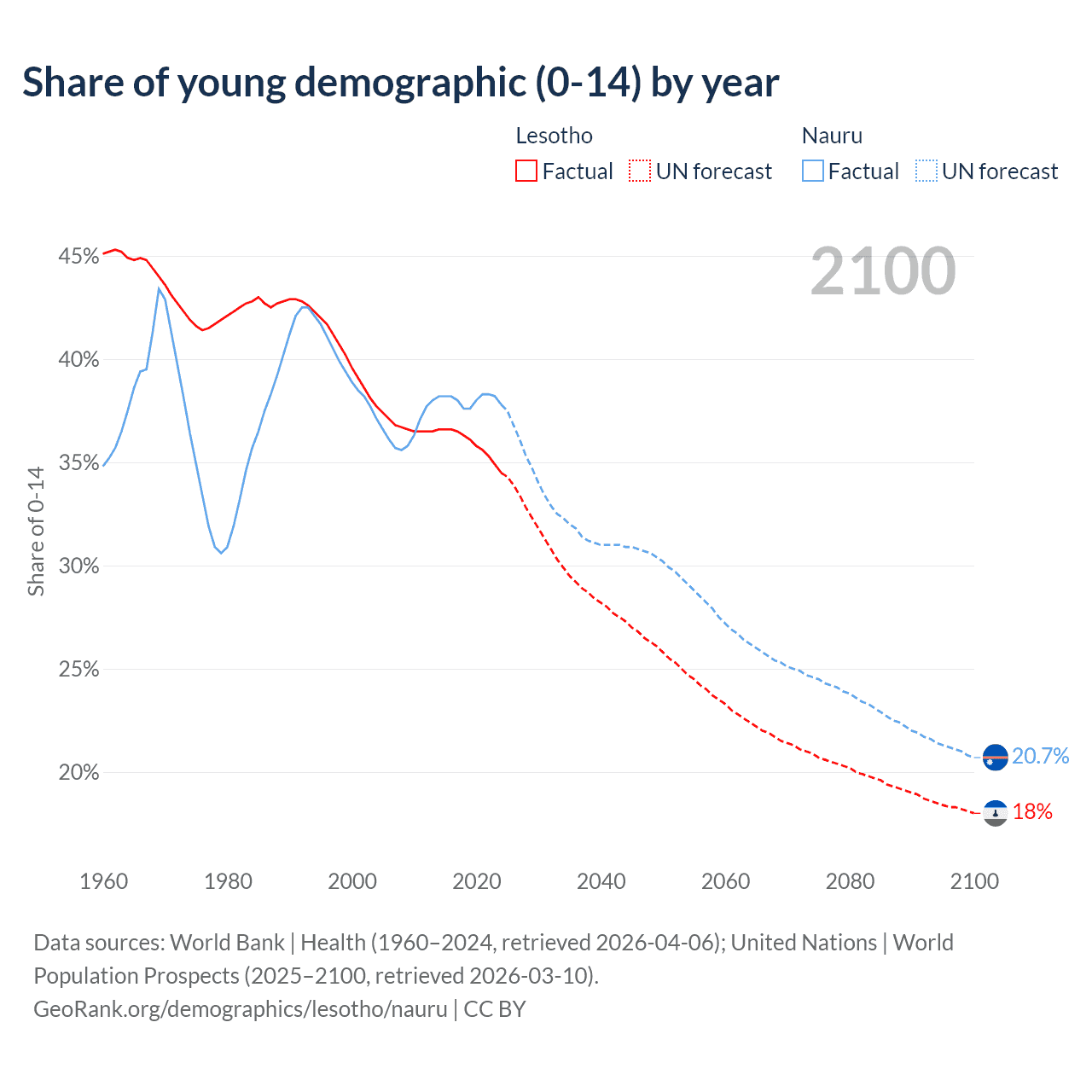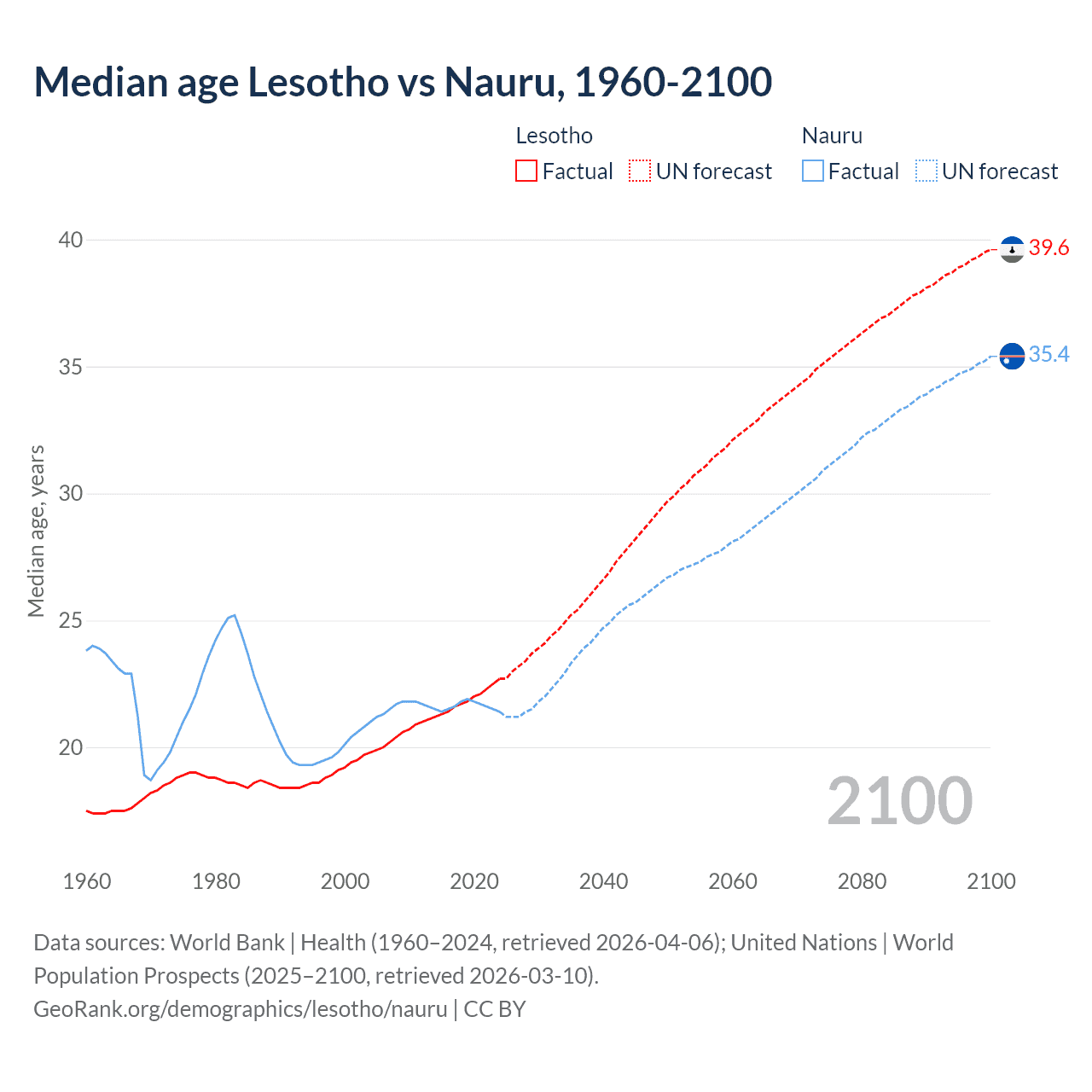 Median age Lesotho vs Nauru, 1960-2100