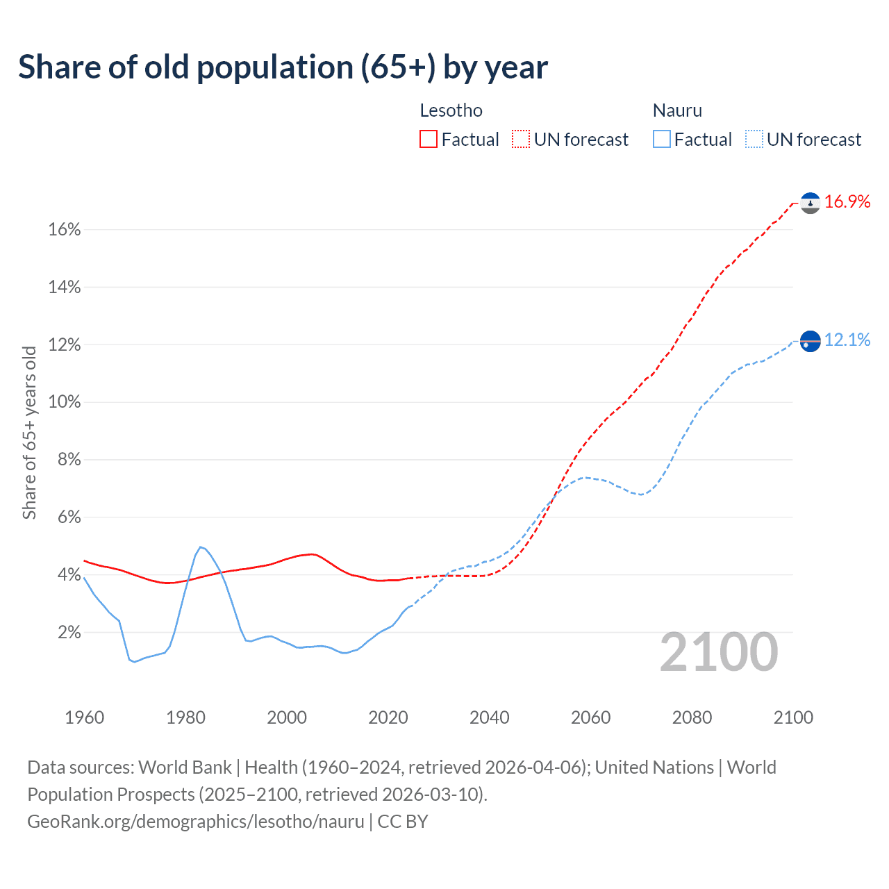 The share of older people aged 65 and over is 3.86% in Lesotho and 2.85% in Nauru. Life expectancy in Lesotho compared to Nauru .