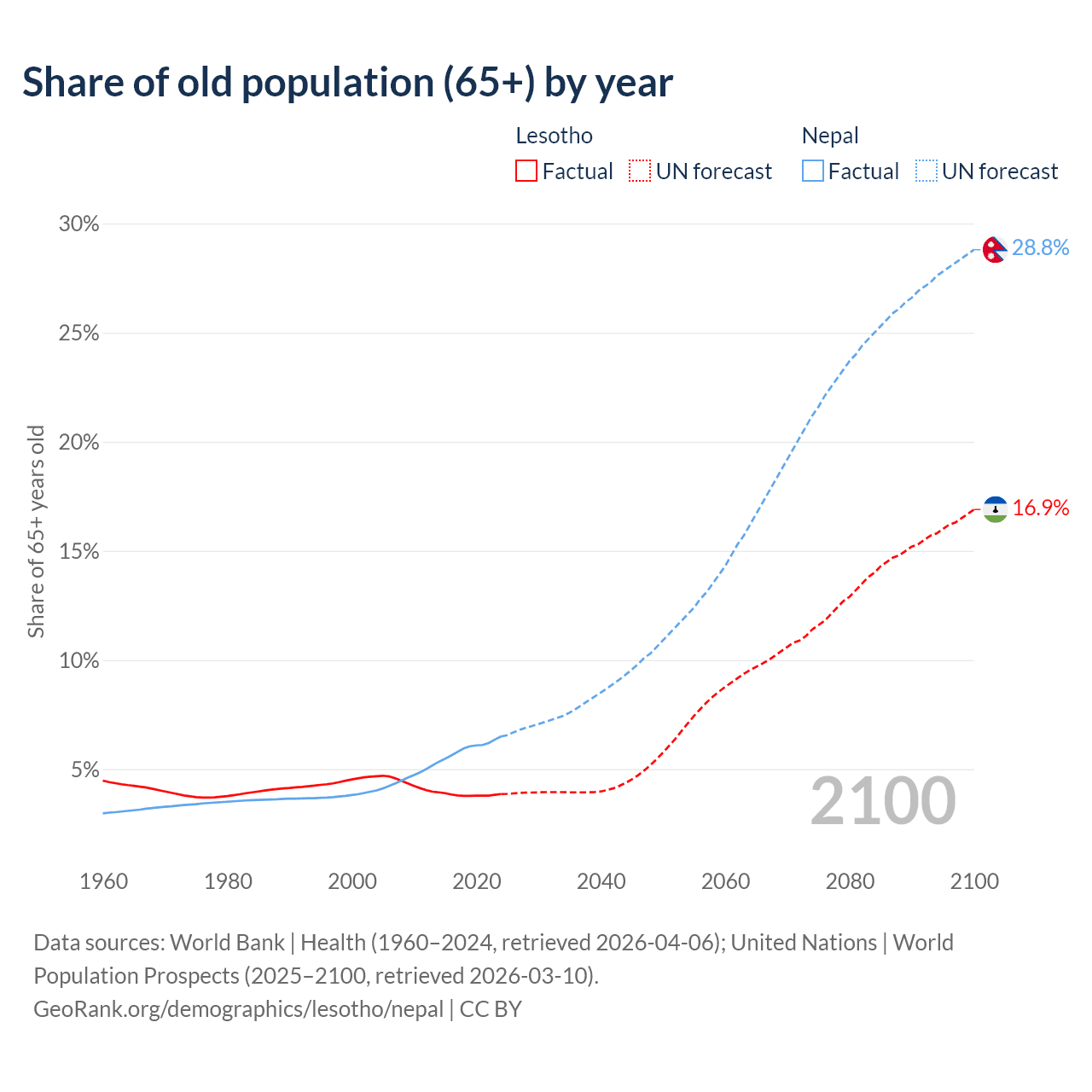 The share of older people aged 65 and over is 3.86% in Lesotho and 6.5% in Nepal. Life expectancy in Lesotho compared to Nepal .