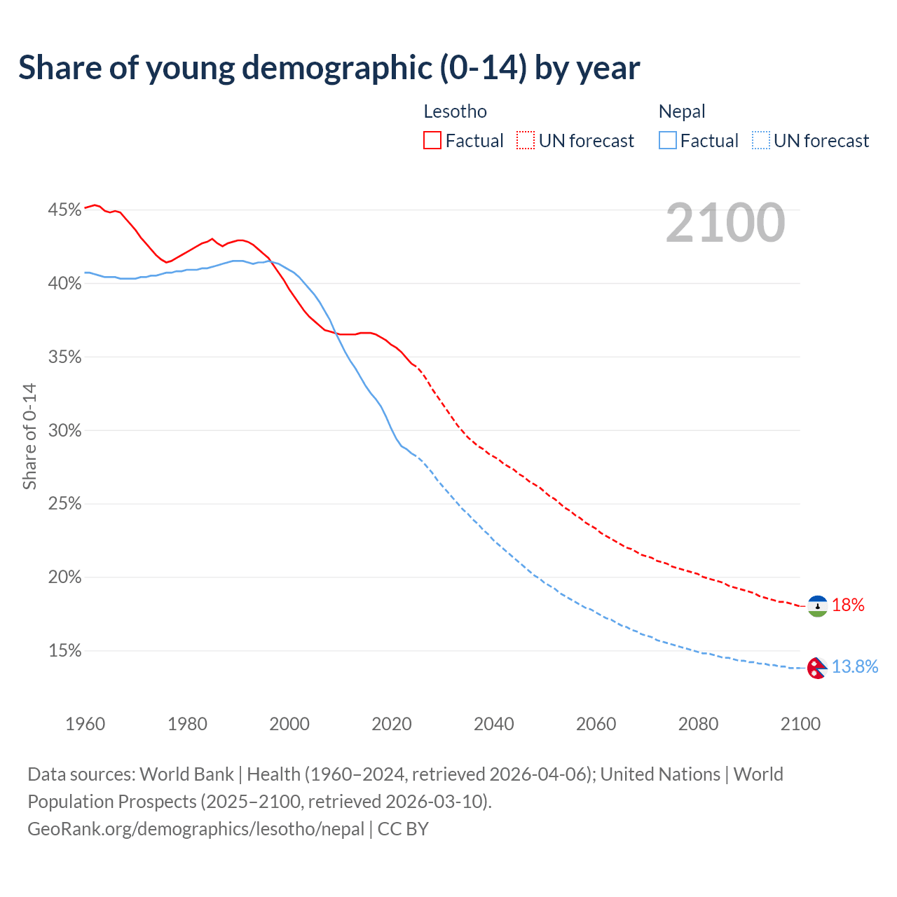 - The share of young demographic (0-15 years old) in Lesotho is 34.5% vs 28.4% in Nepal.