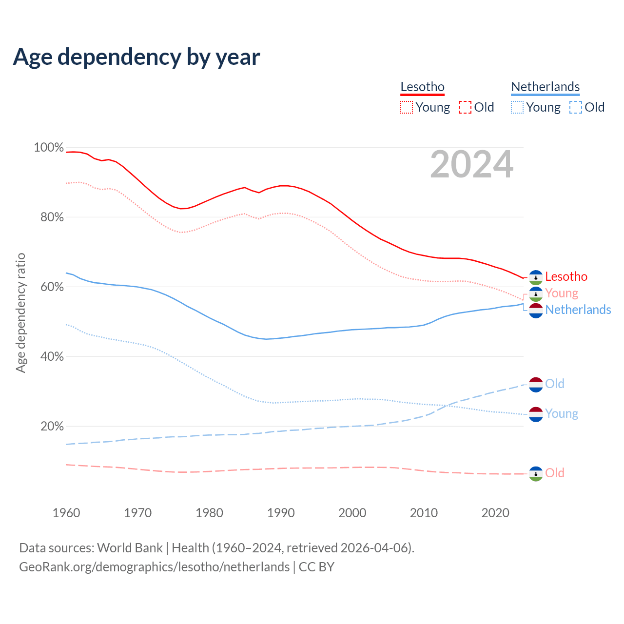 - The share of old-age demographic (65+) in Lesotho is 3.86% vs 20.5% in the Netherlands.