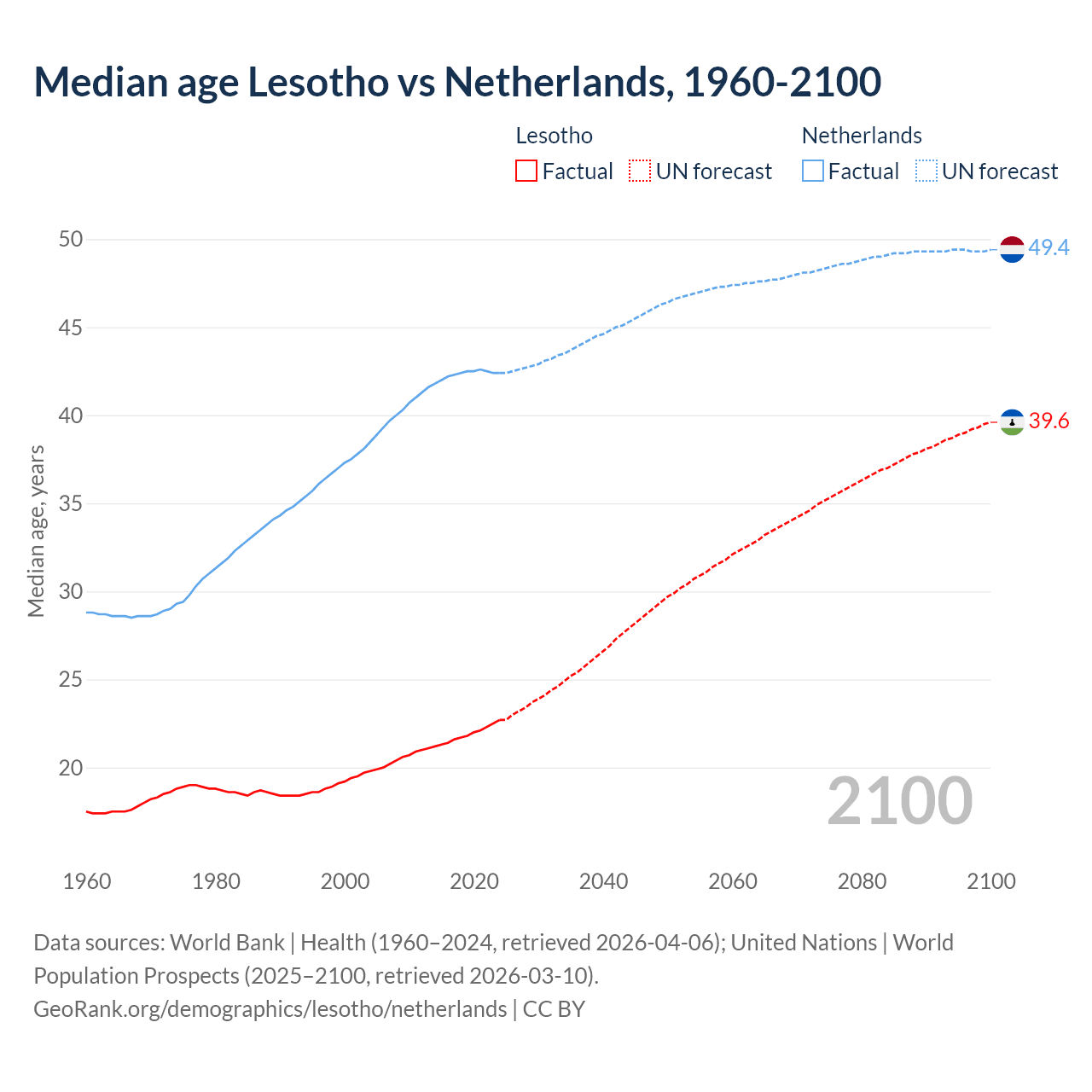 Median age Lesotho vs Netherlands, 1960-2100