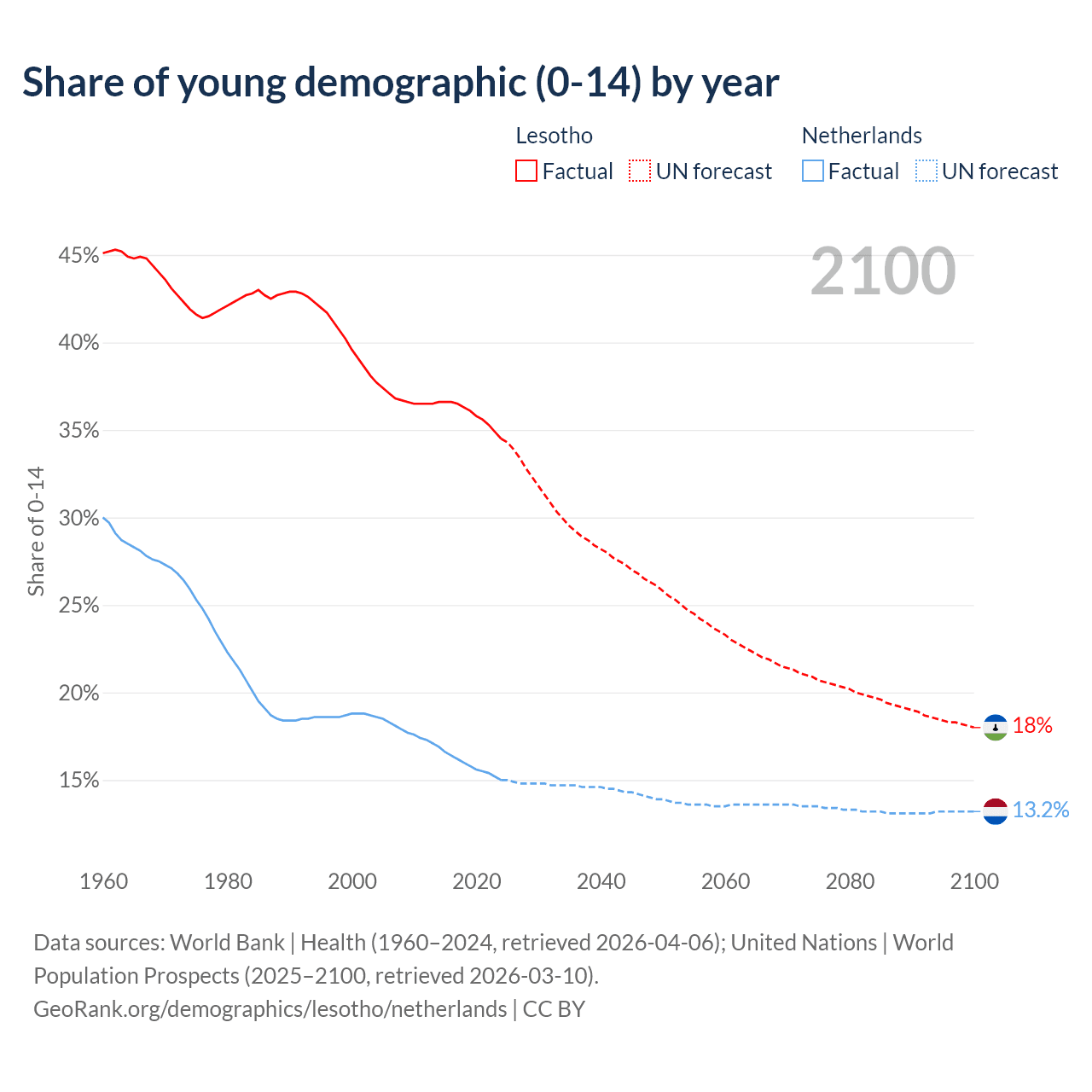 - The share of young demographic (0-15 years old) in Lesotho is 34.5% vs 15% in the Netherlands.