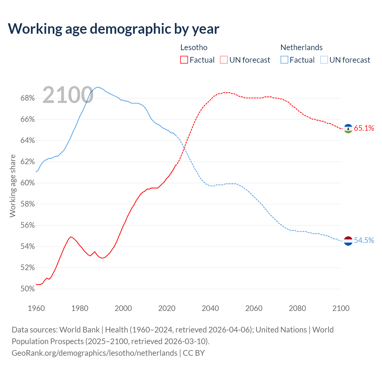 The share of older people aged 65 and over is 3.86% in Lesotho and 20.5% in the Netherlands. Life expectancy in Lesotho compared to the Netherlands .