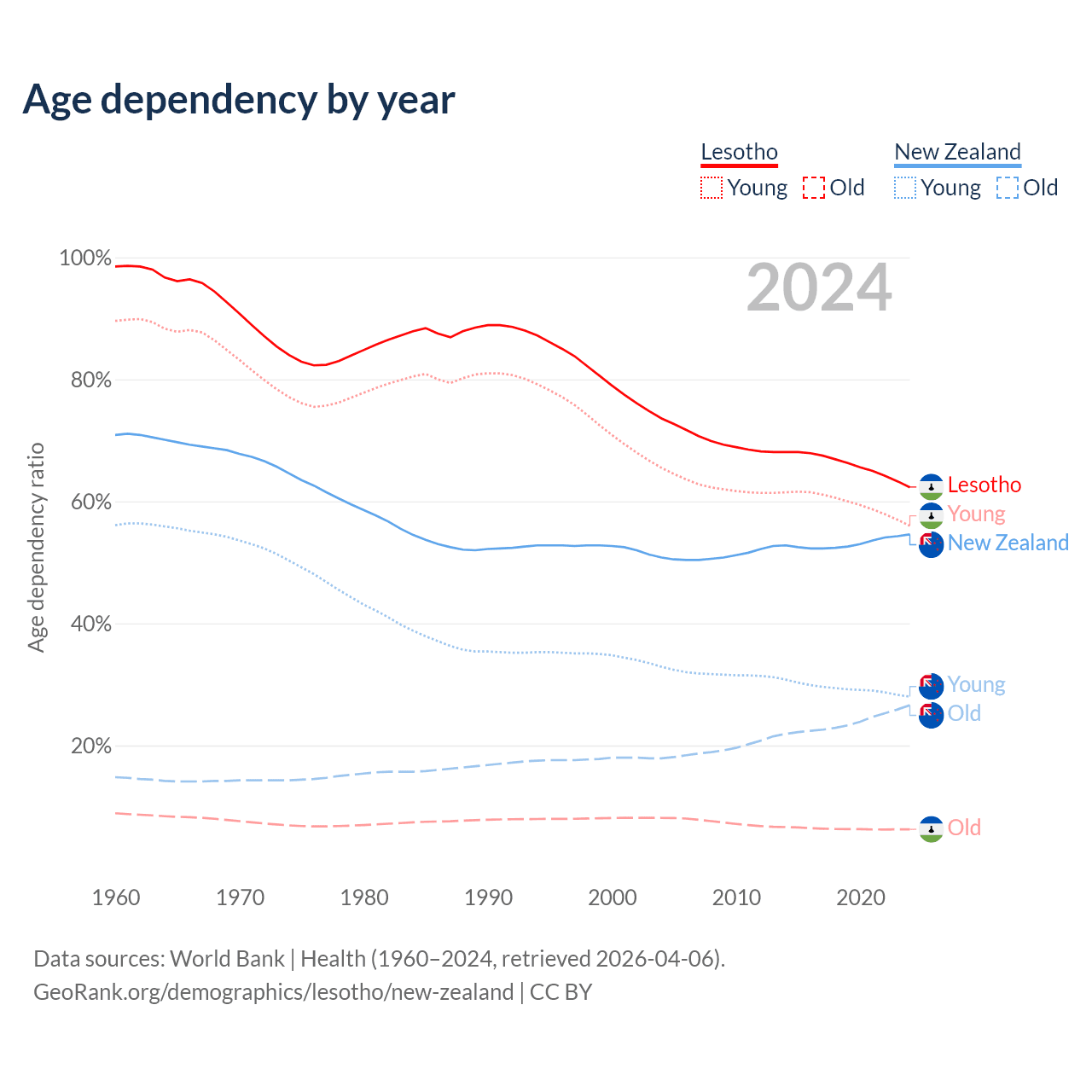 - Lesotho is ranked 143/196 by median age (oldest to youngest) vs 56/196 for New Zealand.