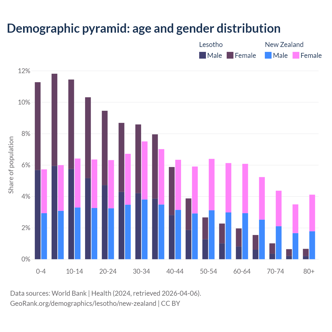 The share of older people aged 65 and over is 3.86% in Lesotho and 17.2% in New Zealand. Life expectancy in Lesotho compared to New Zealand .
