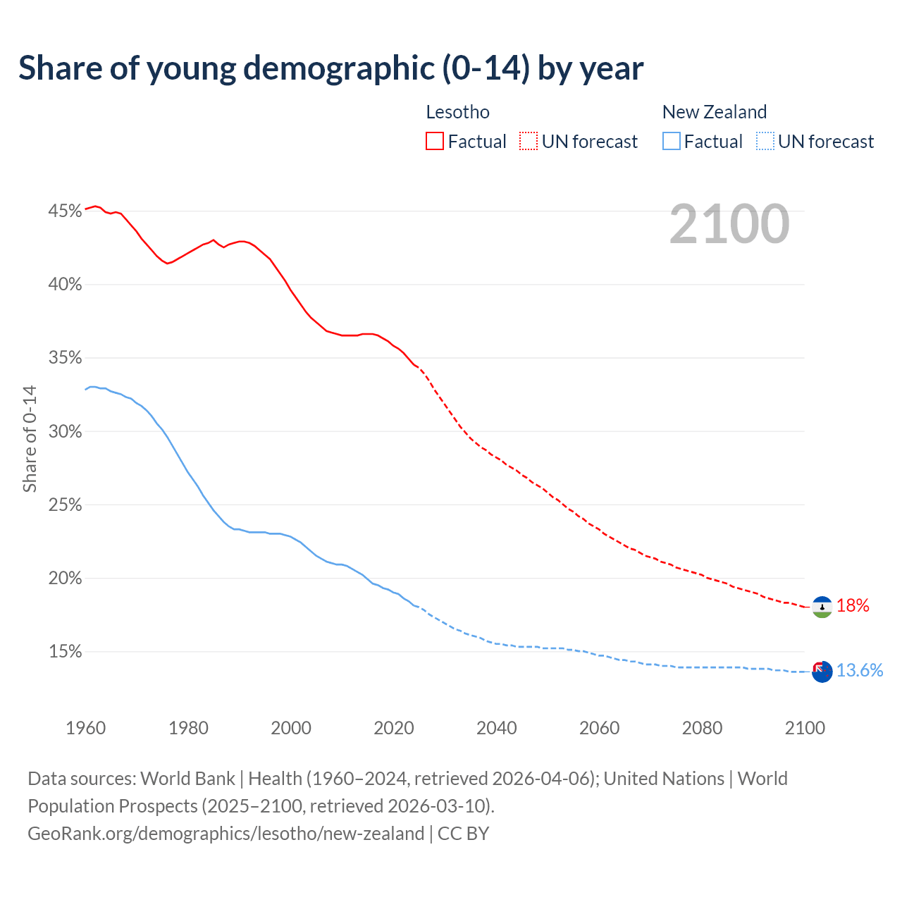 - The share of young demographic (0-15 years old) in Lesotho is 34.5% vs 18.1% in New Zealand.