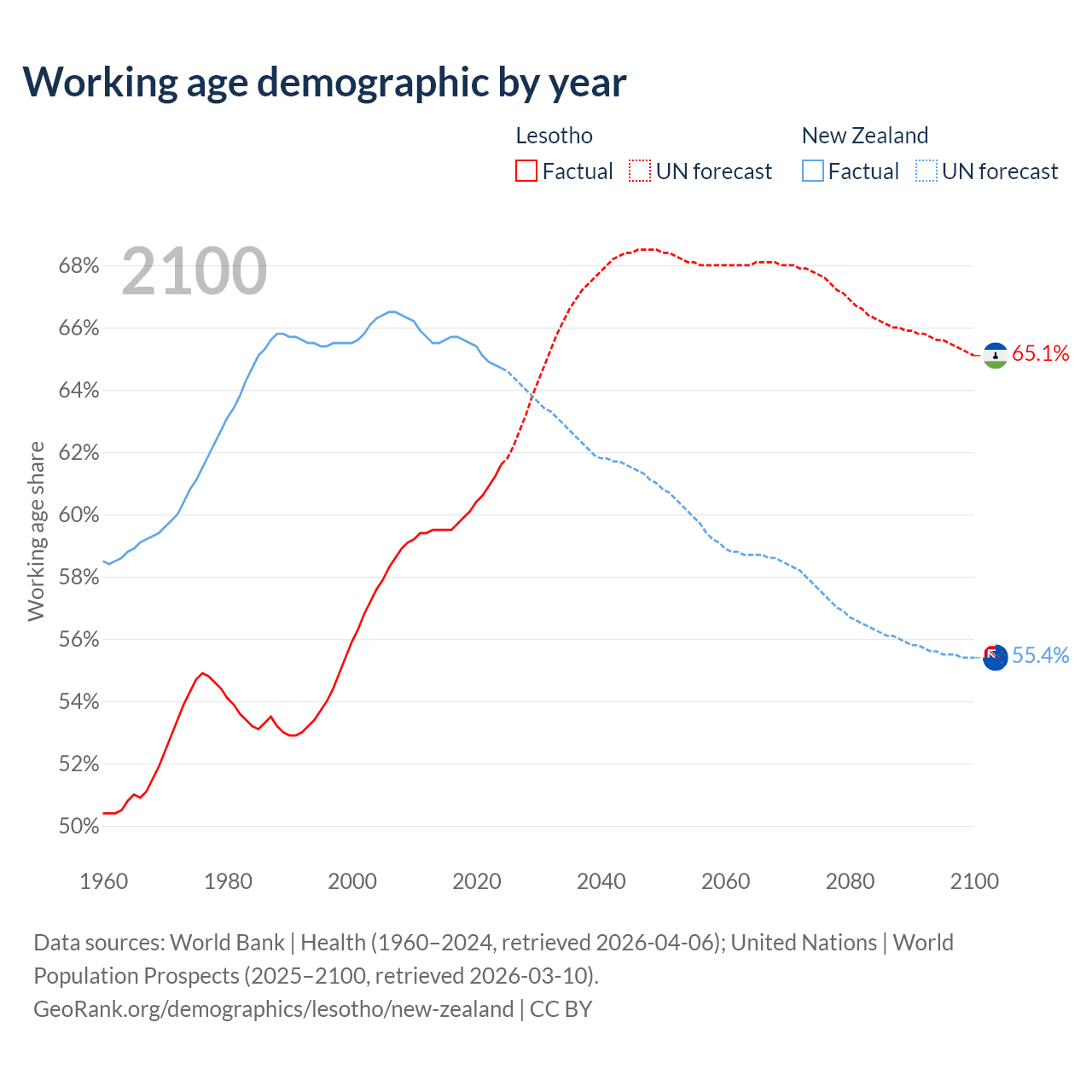 - Lesotho has 1.48M working age adults (aged 15-64) vs 3.48M in New Zealand.