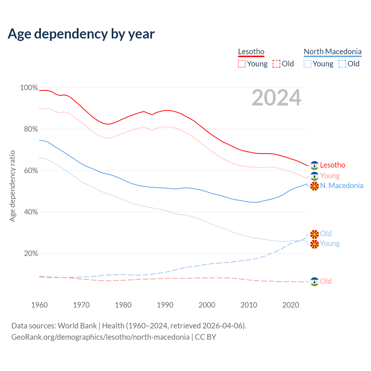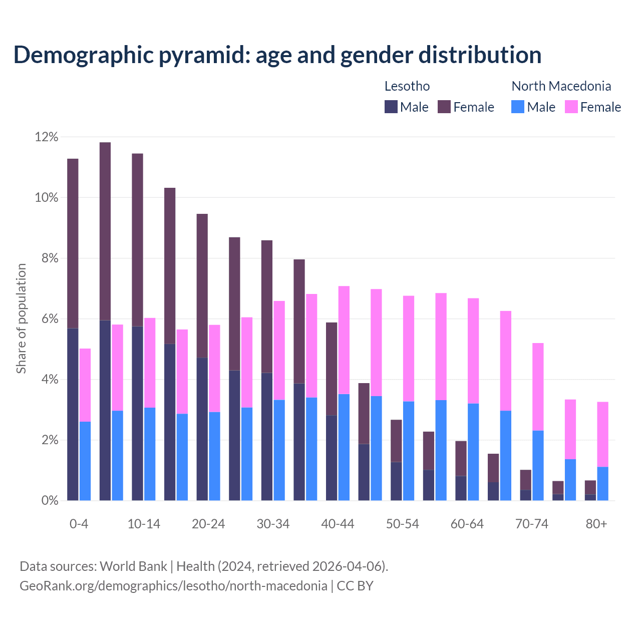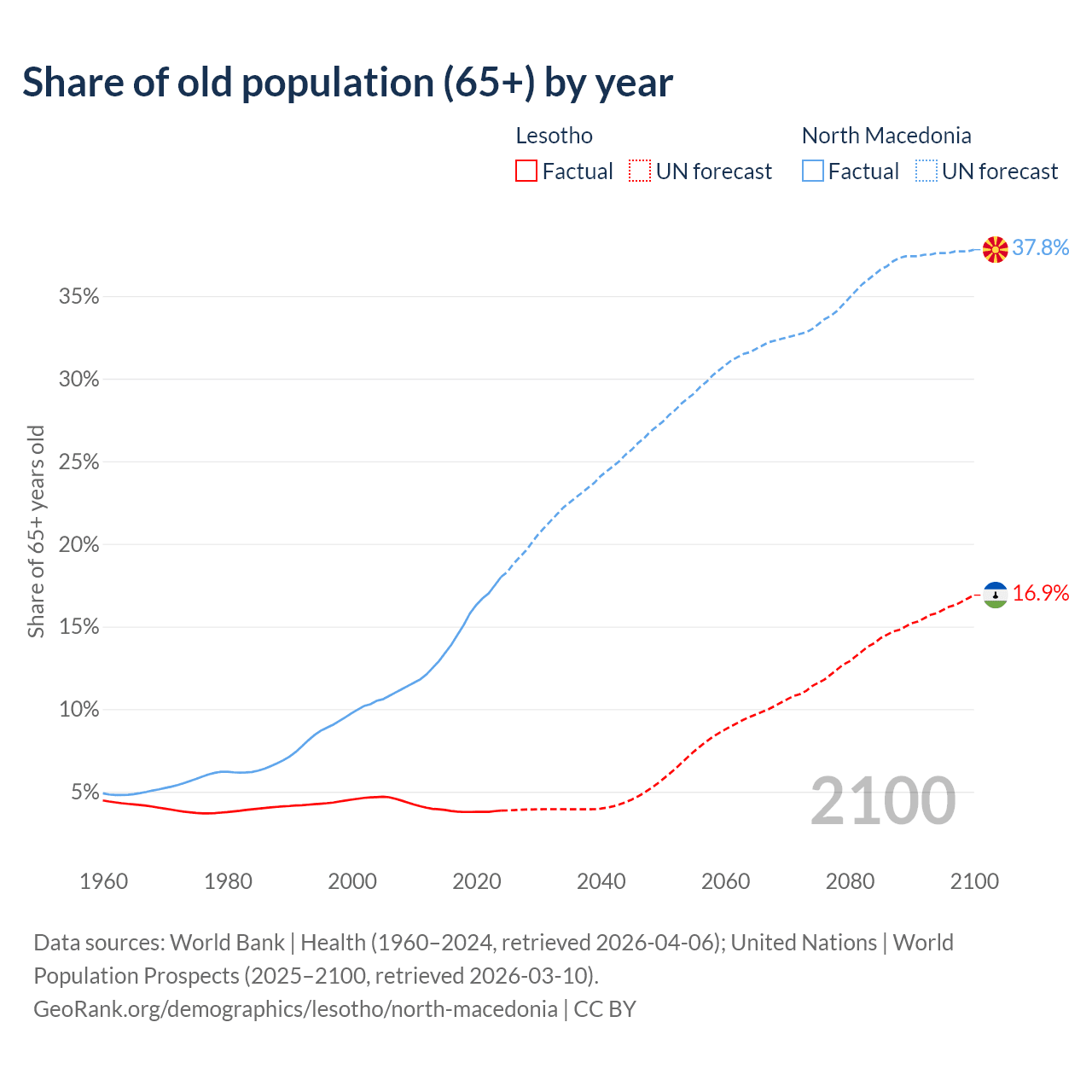 The share of older people aged 65 and over is 3.86% in Lesotho and 18% in North Macedonia. Life expectancy in Lesotho compared to North Macedonia .
