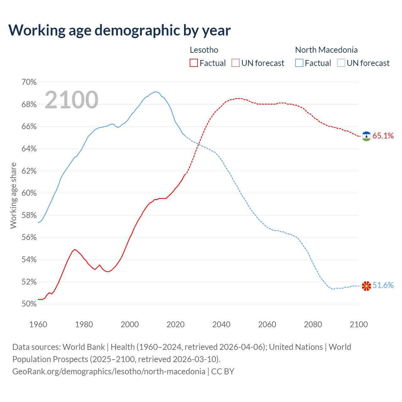 - The share of young demographic (0-15 years old) in Lesotho is 34.5% vs 16.8% in North Macedonia.
