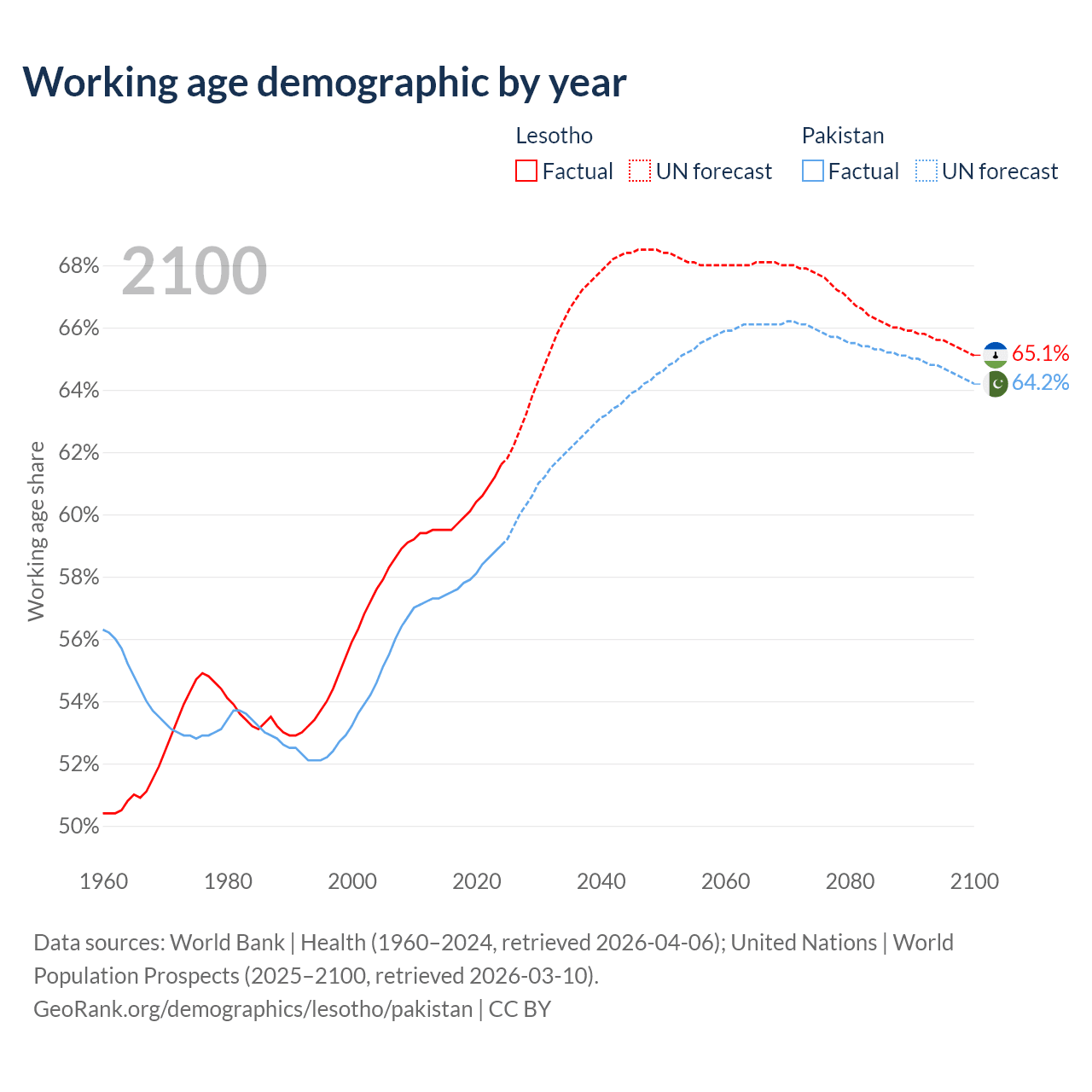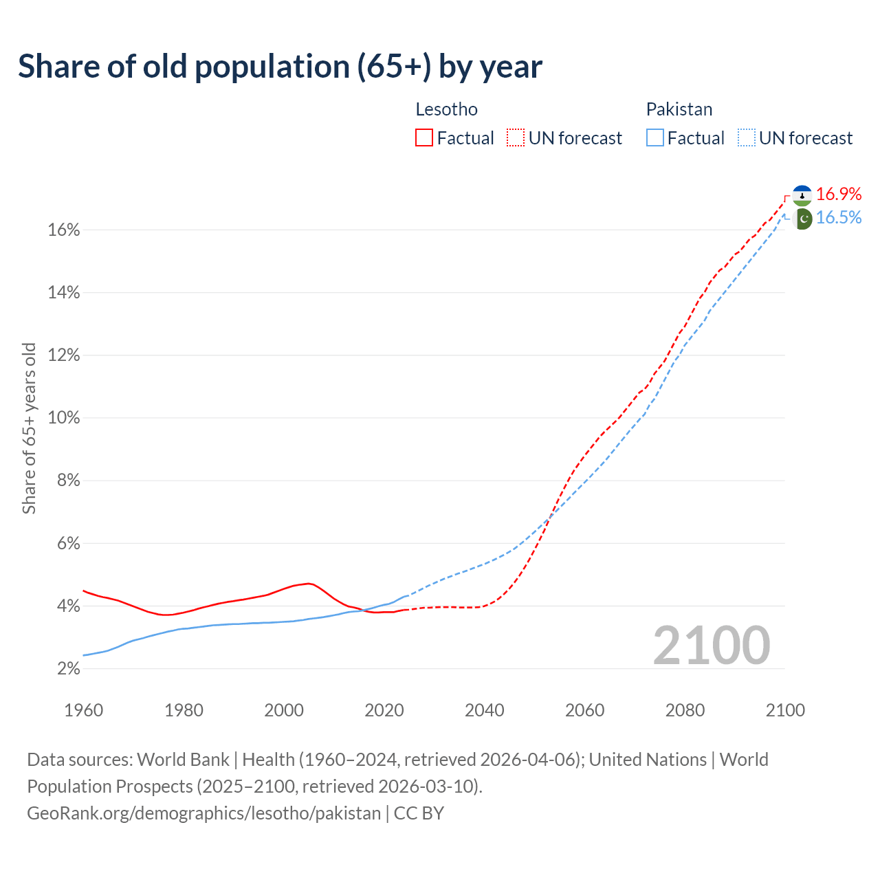 The share of older people aged 65 and over is 3.86% in Lesotho and 4.28% in Pakistan. Life expectancy in Lesotho compared to Pakistan .