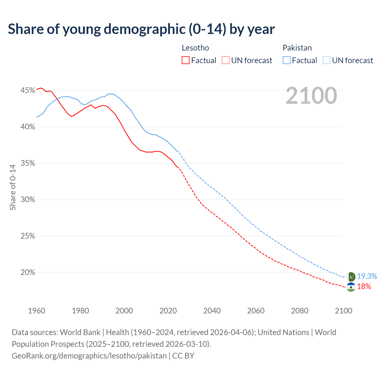- The share of young demographic (0-15 years old) in Lesotho is 34.5% vs 36.7% in Pakistan.