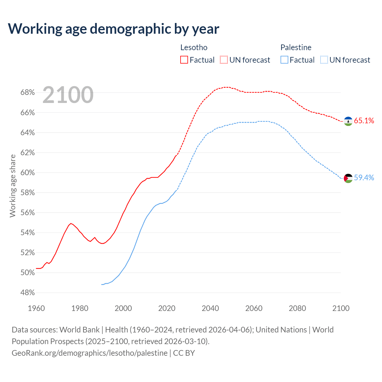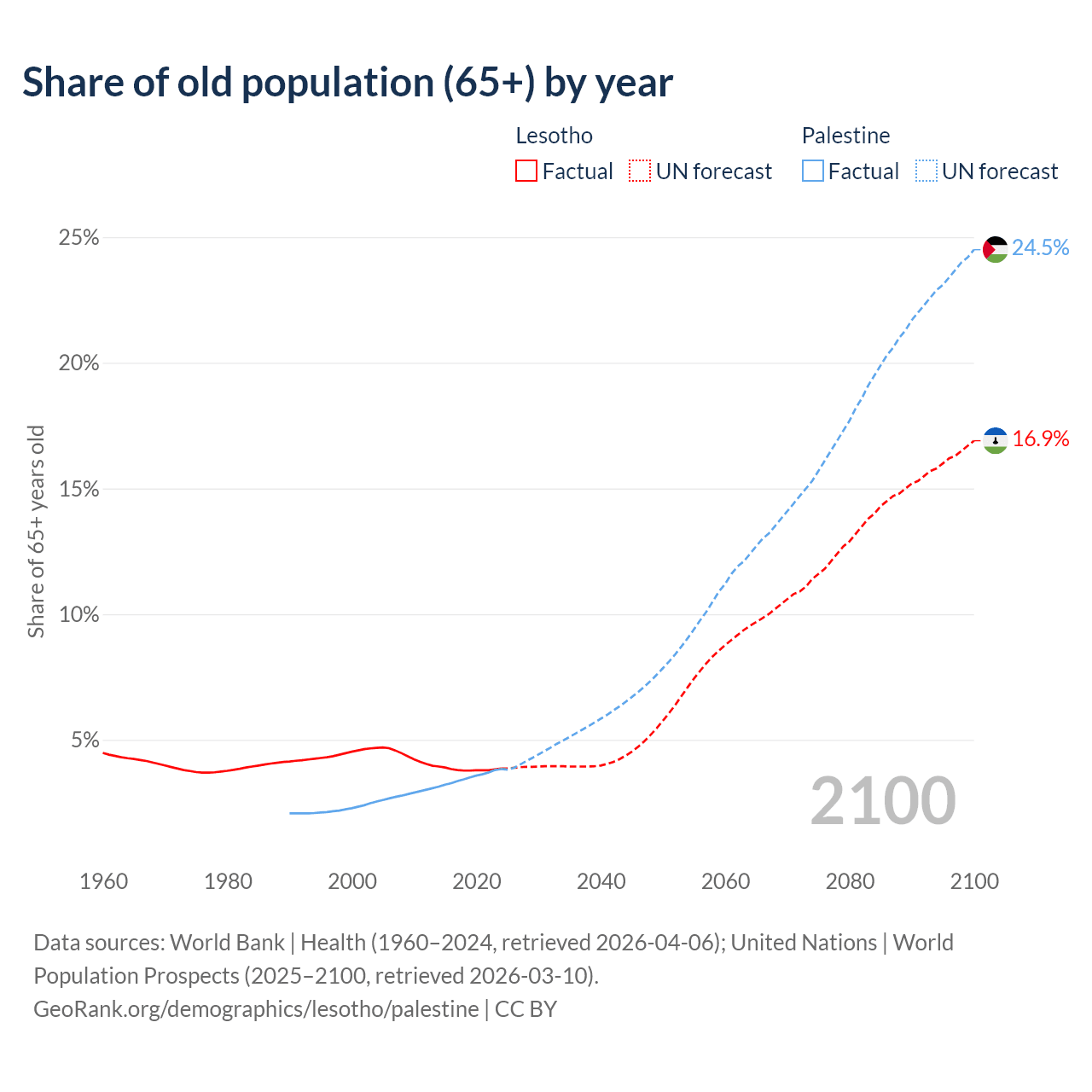 The share of older people aged 65 and over is 3.86% in Lesotho and 3.84% in Palestine. Life expectancy in Lesotho compared to Palestine .