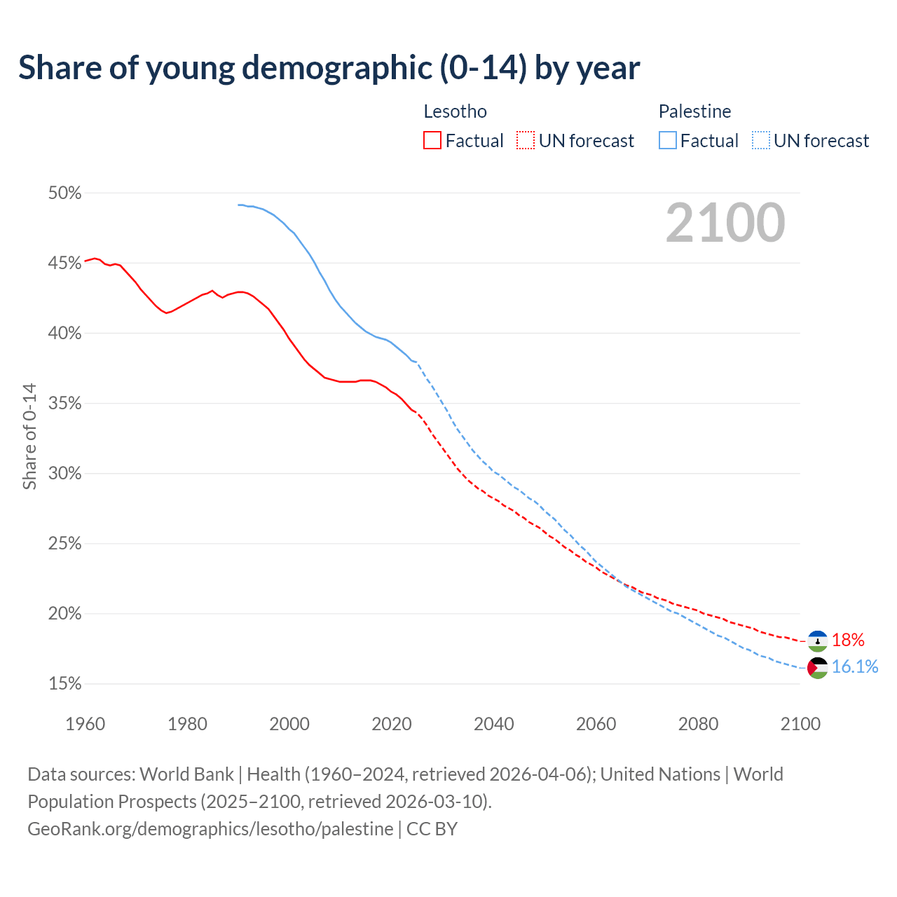 - The share of young demographic (0-15 years old) in Lesotho is 34.5% vs 38% in Palestine.