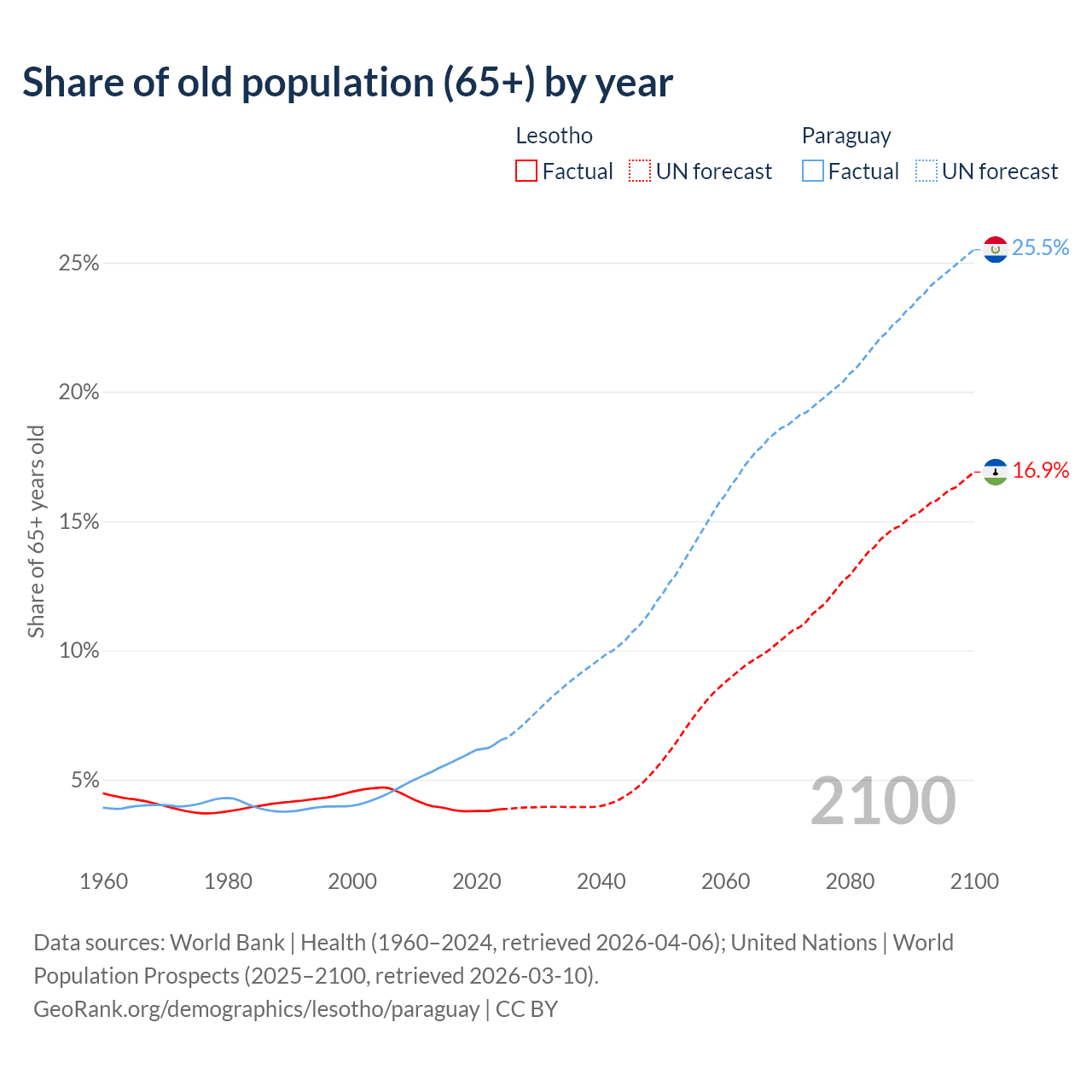 - The share of old-age demographic (65+) in Lesotho is 3.86% vs 6.54% in Paraguay.