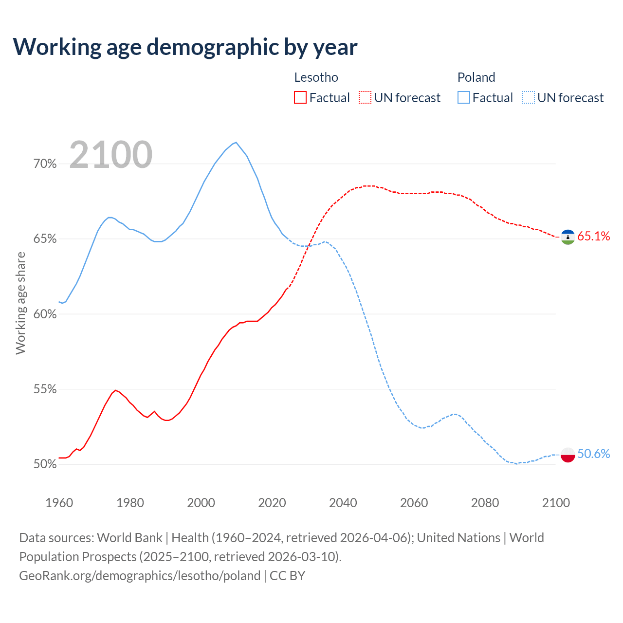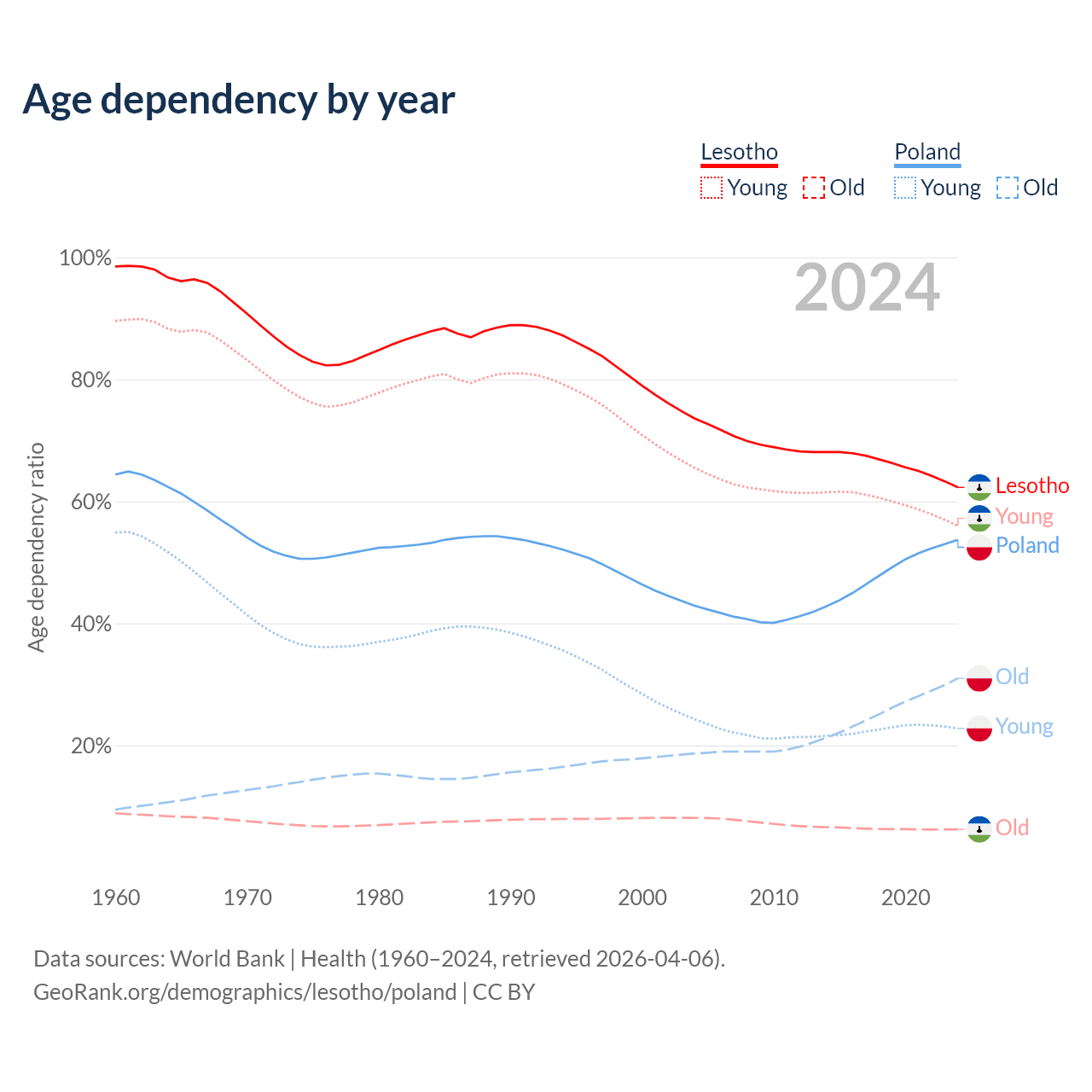 The share of older people aged 65 and over is 3.86% in Lesotho and 20.1% in Poland. Life expectancy in Lesotho compared to Poland .