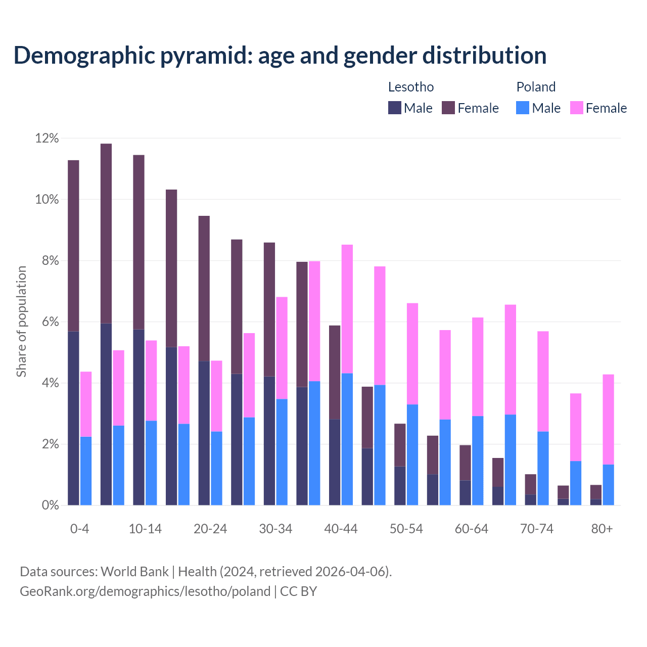 - The share of old-age demographic (65+) in Lesotho is 3.86% vs 20.1% in Poland.
