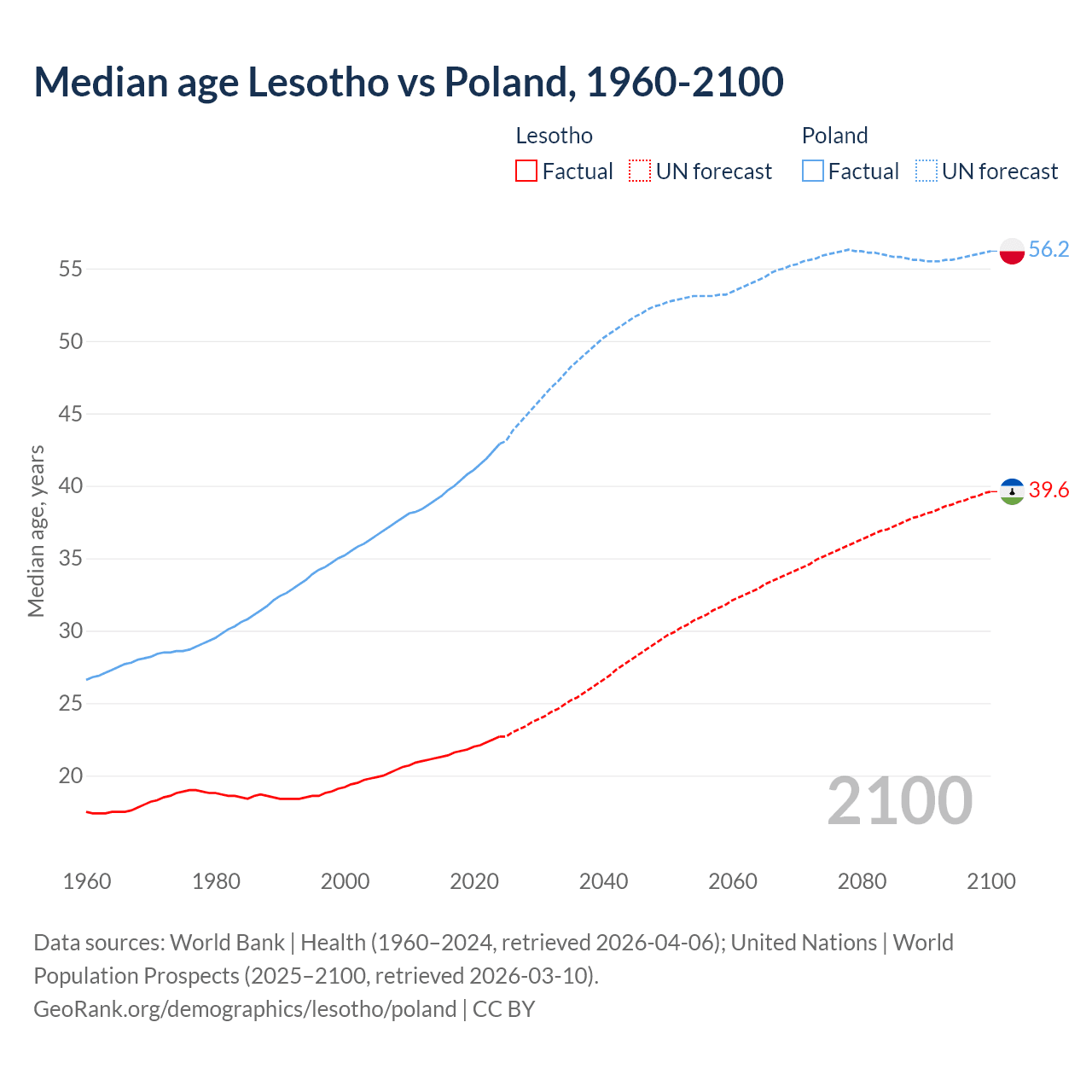 Median age Lesotho vs Poland, 1960-2100