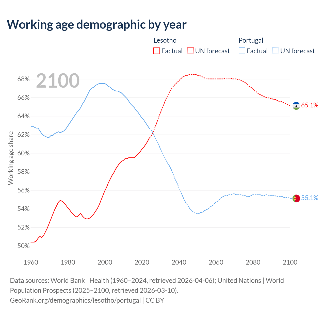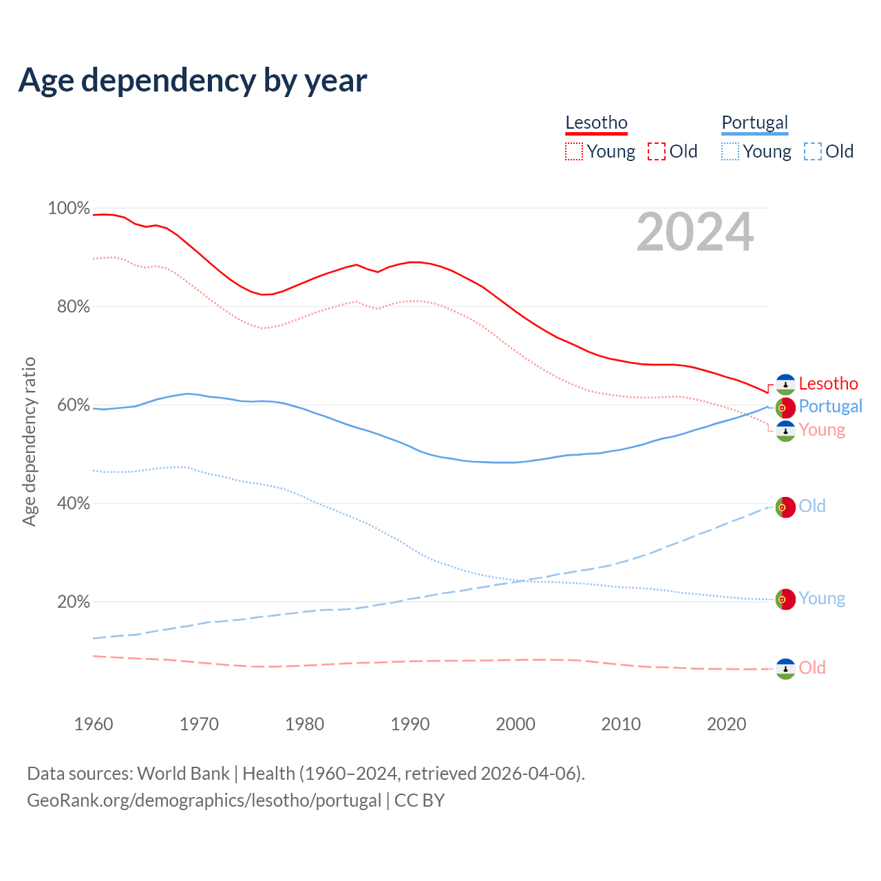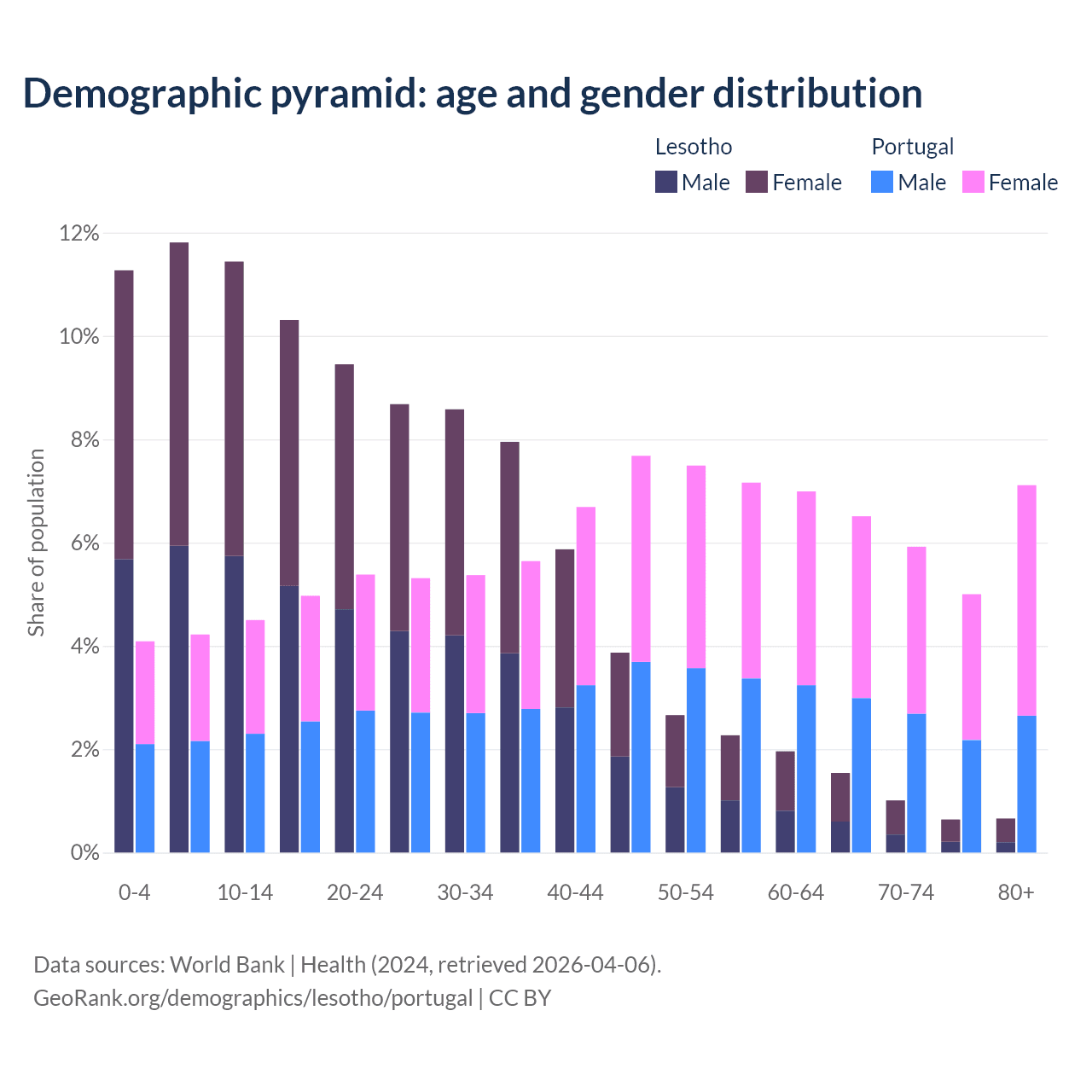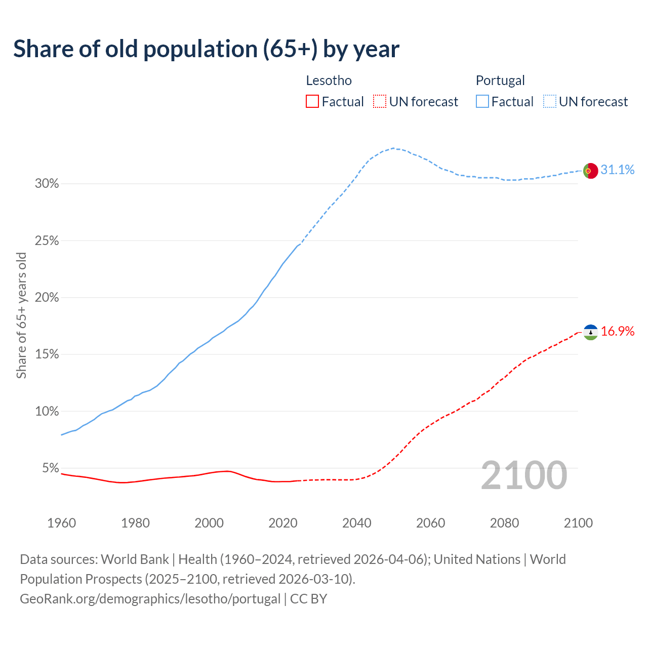 The share of older people aged 65 and over is 3.86% in Lesotho and 24.5% in Portugal. Life expectancy in Lesotho compared to Portugal .