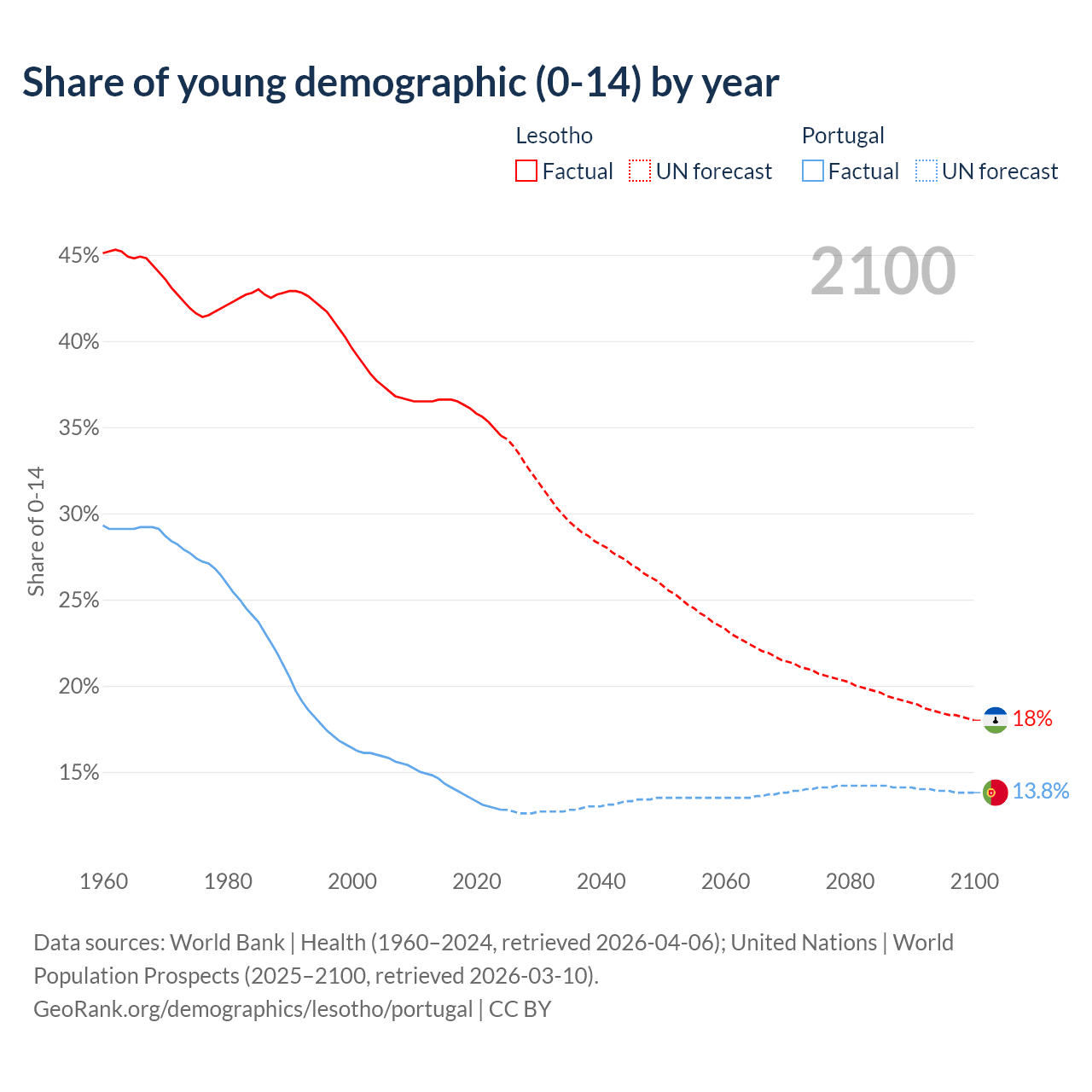- The share of young demographic (0-15 years old) in Lesotho is 34.5% vs 12.8% in Portugal.
