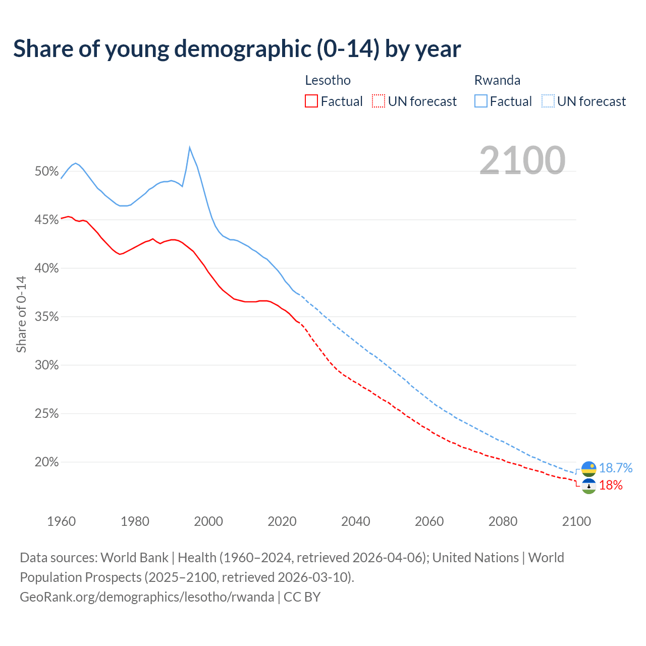 Median age Lesotho vs Rwanda, 1960-2100