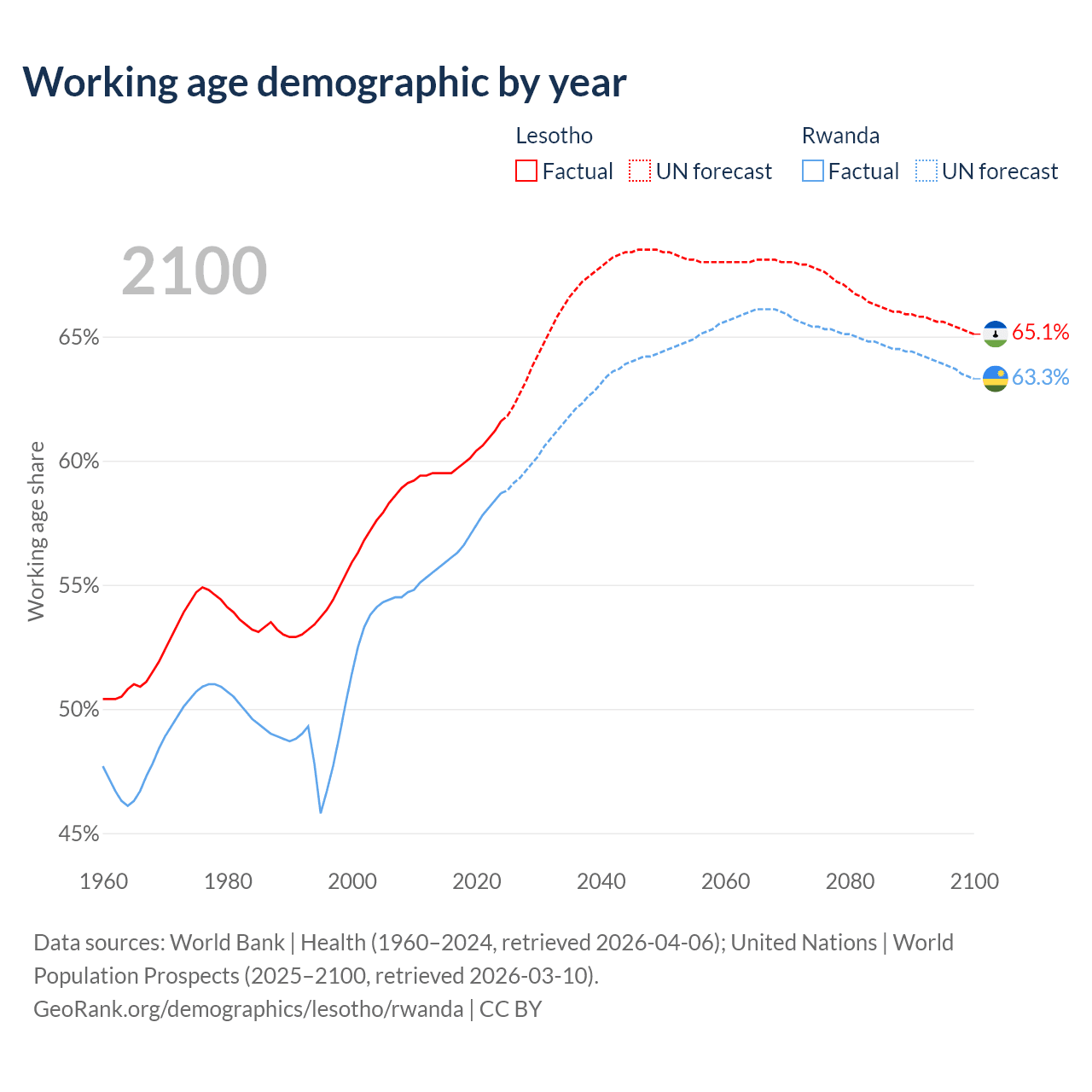 The share of older people aged 65 and over is 3.86% in Lesotho and 3.93% in Rwanda. Life expectancy in Lesotho compared to Rwanda .