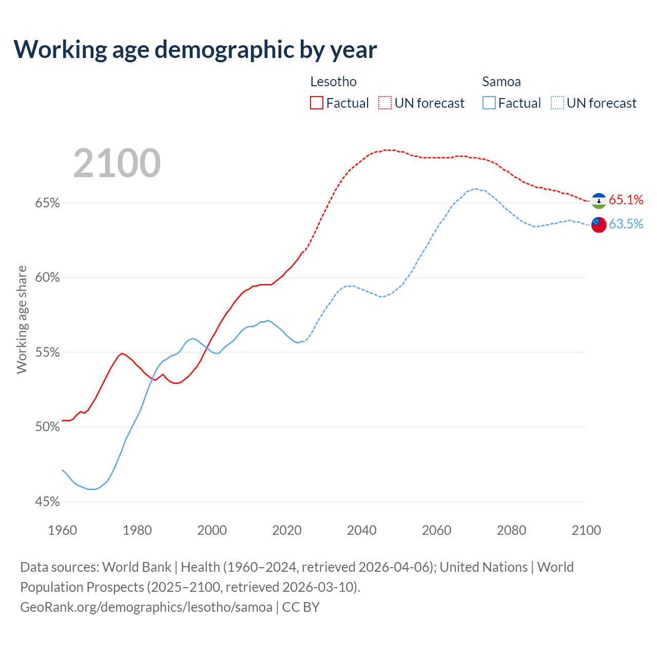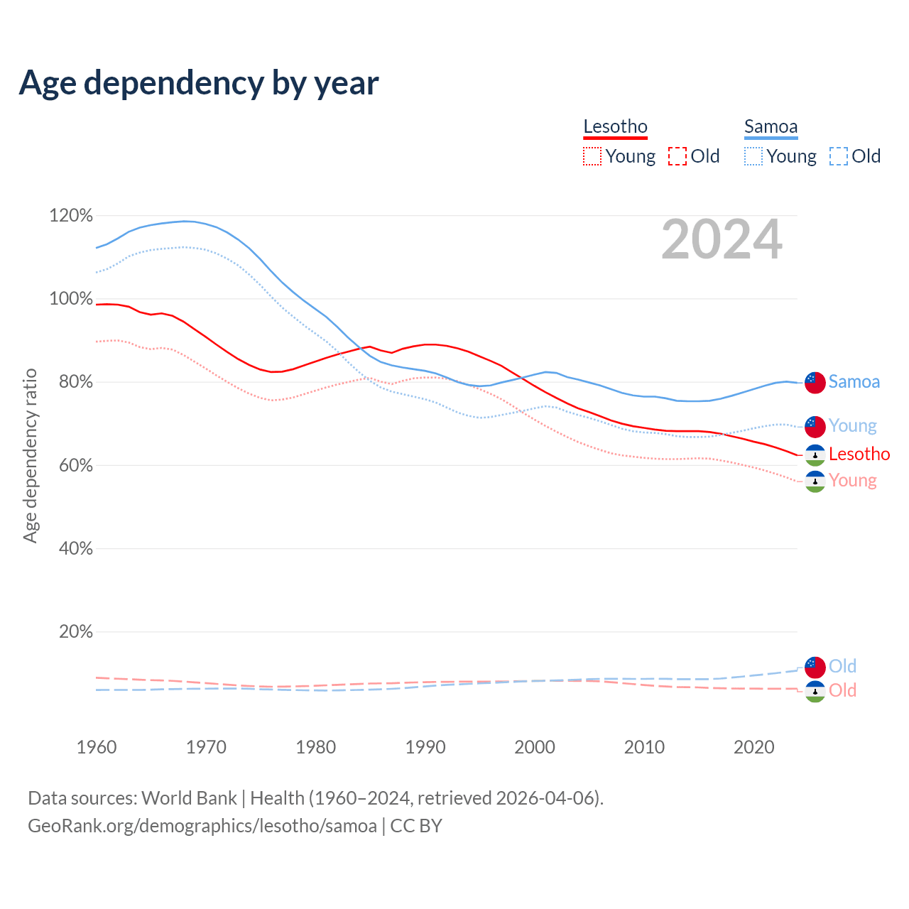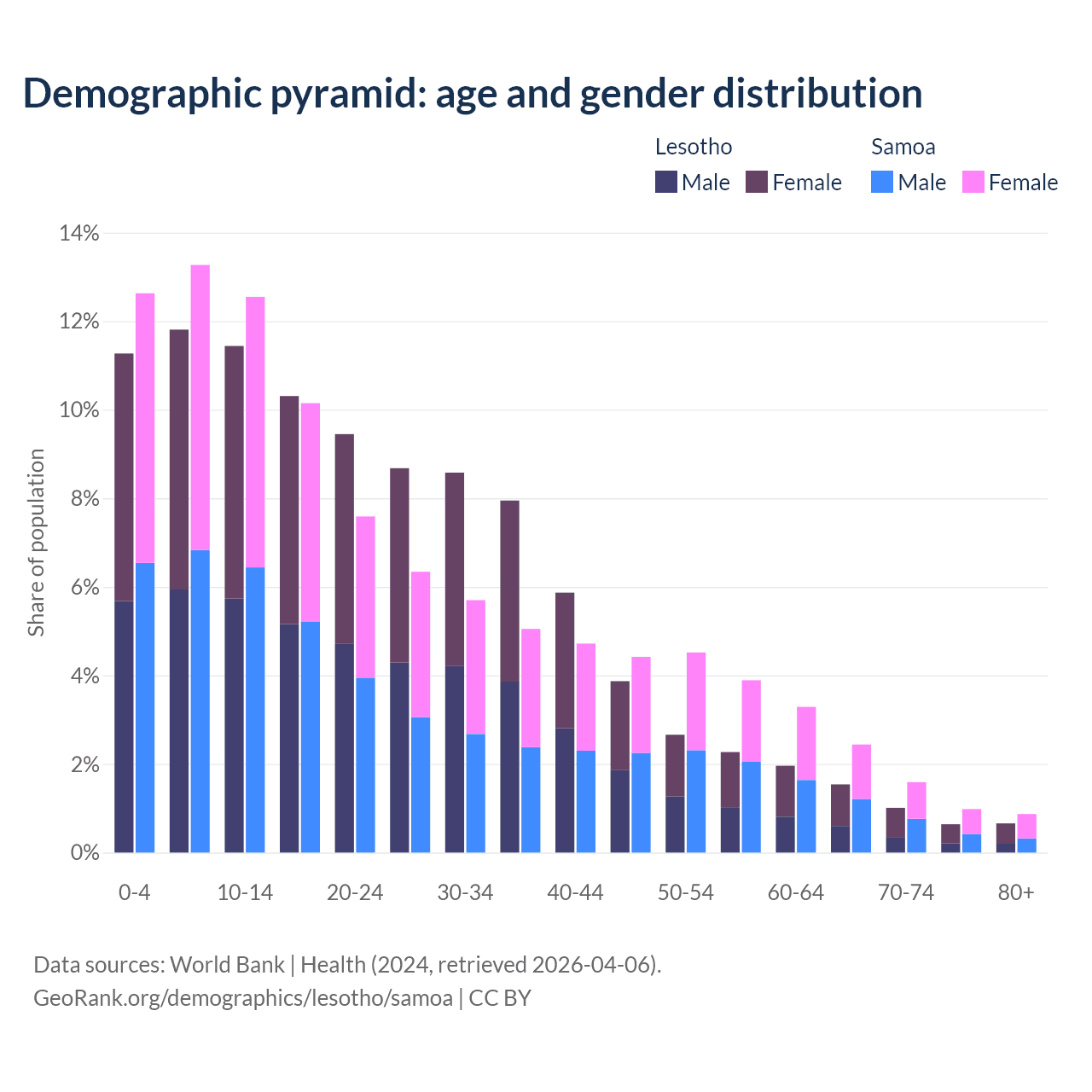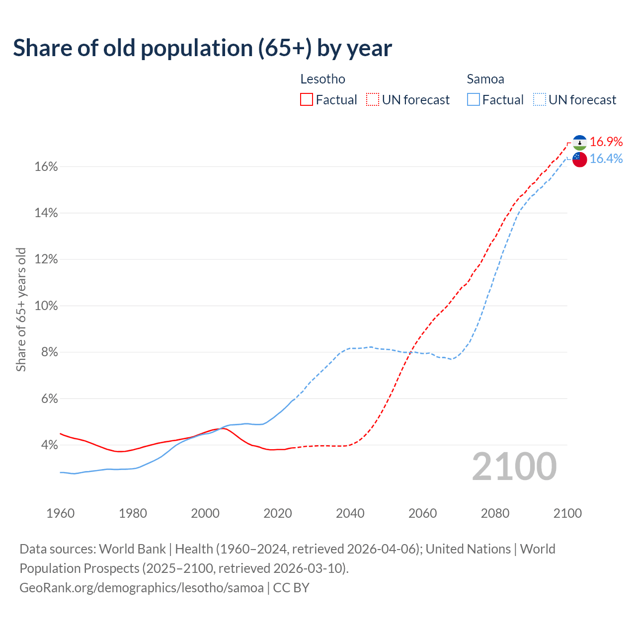 - The share of old-age demographic (65+) in Lesotho is 3.86% vs 5.88% in Samoa.