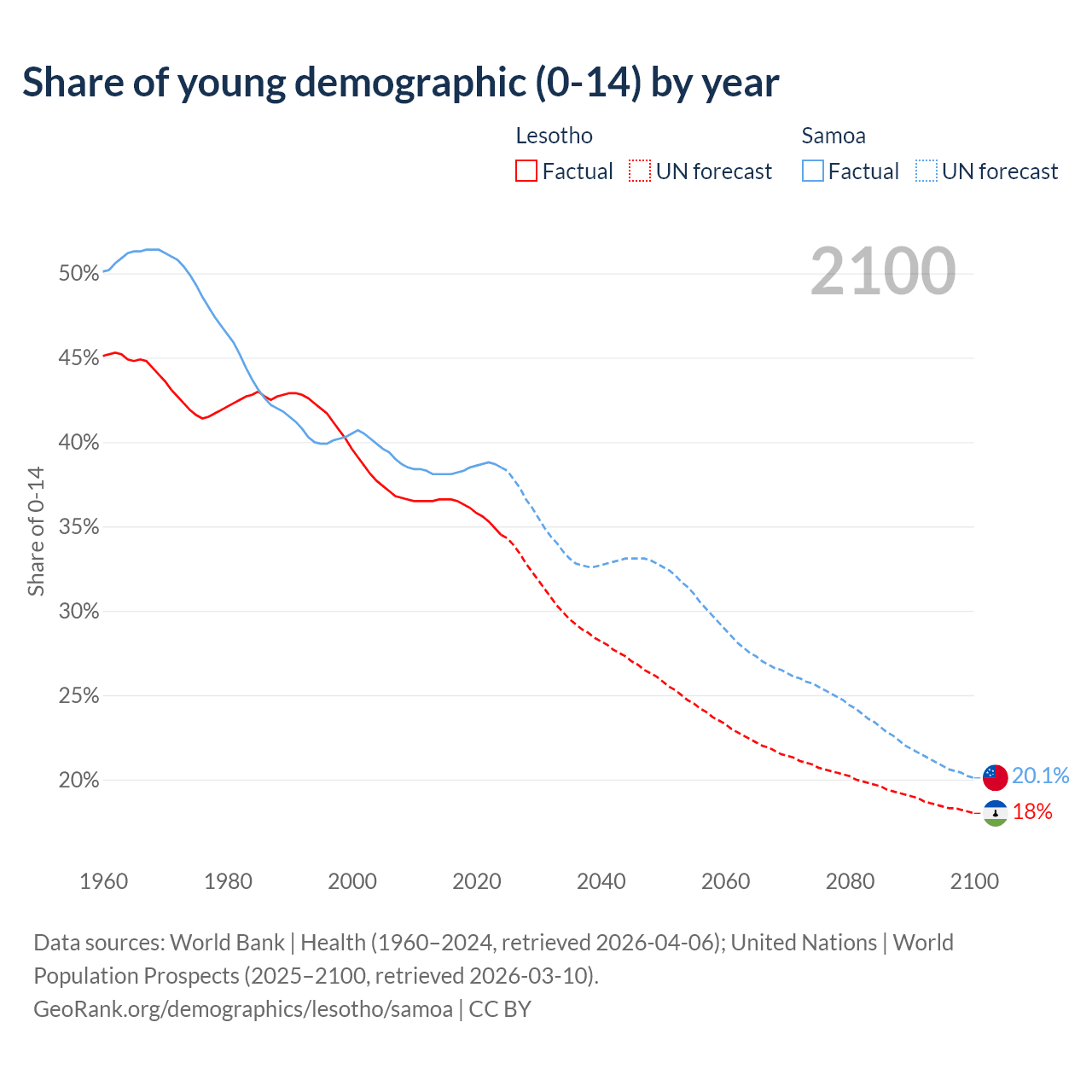 Median age Lesotho vs Samoa, 1960-2100