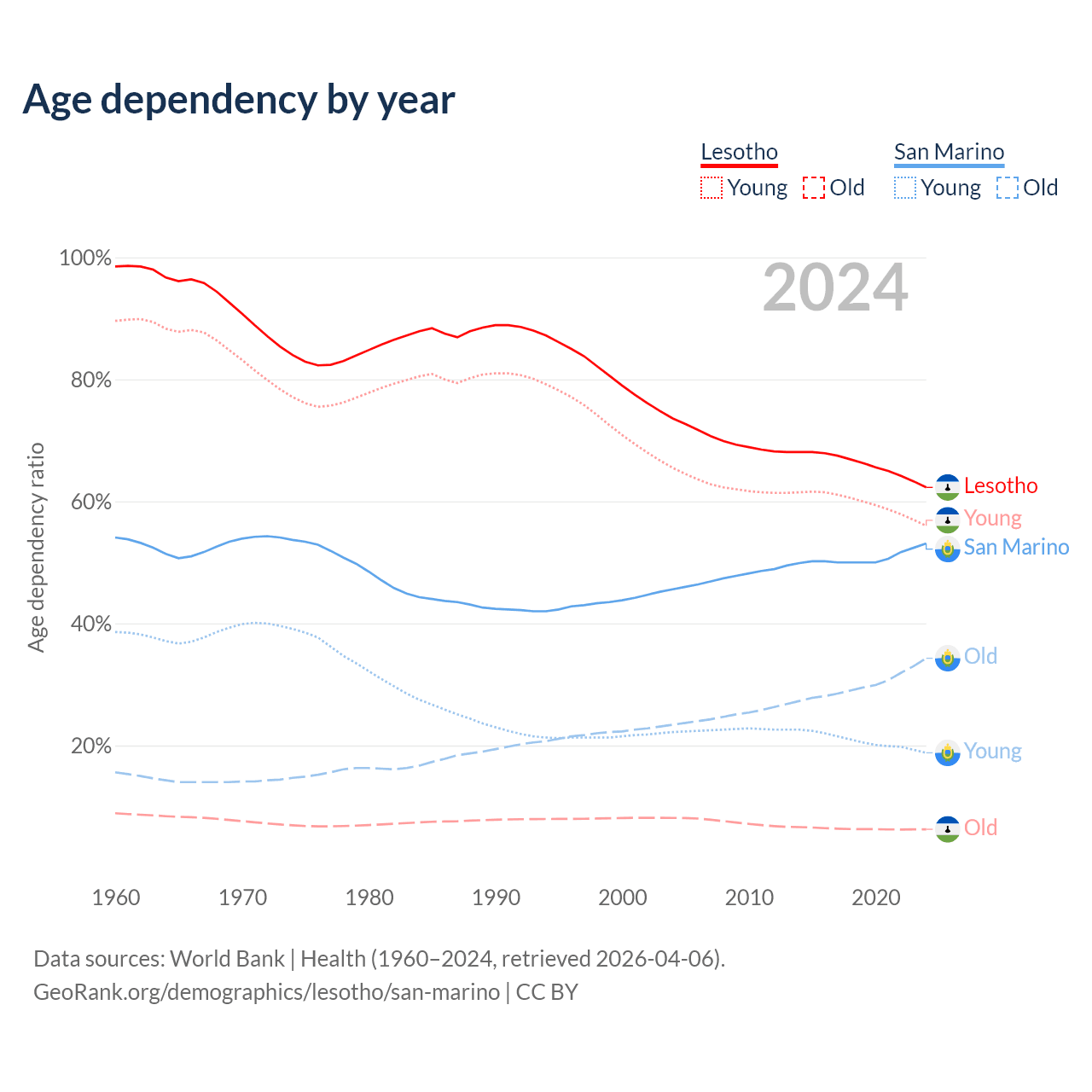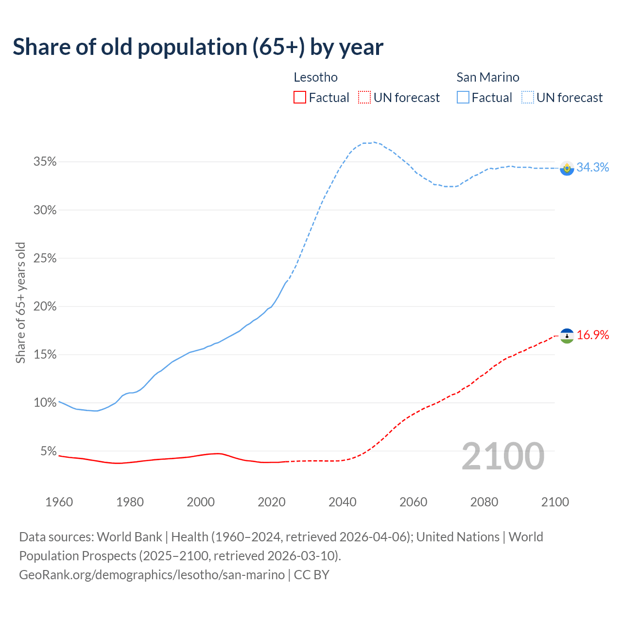 - The share of old-age demographic (65+) in Lesotho is 3.86% vs 22.4% in San Marino.