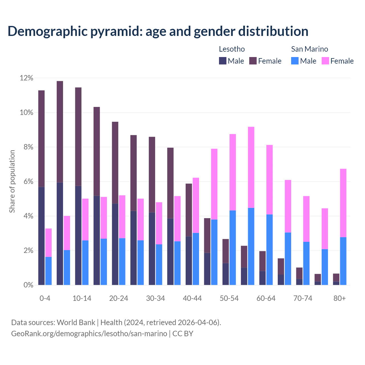 The share of older people aged 65 and over is 3.86% in Lesotho and 22.4% in San Marino. Life expectancy in Lesotho compared to San Marino .