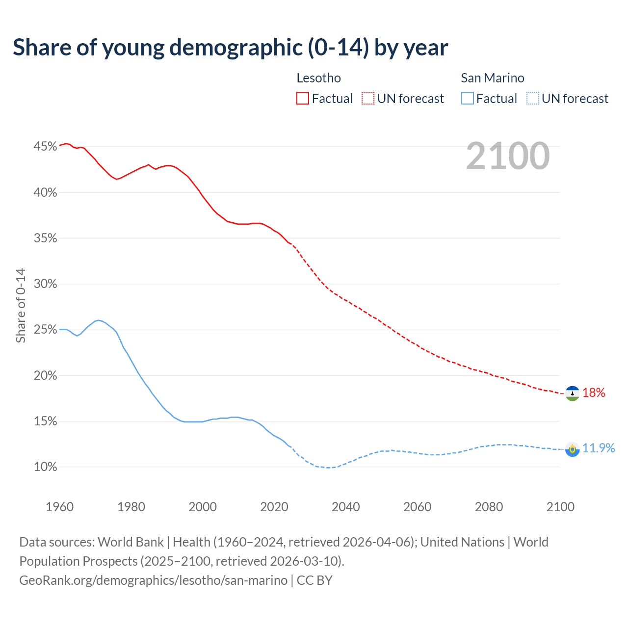 - The share of young demographic (0-15 years old) in Lesotho is 34.5% vs 12.3% in San Marino.