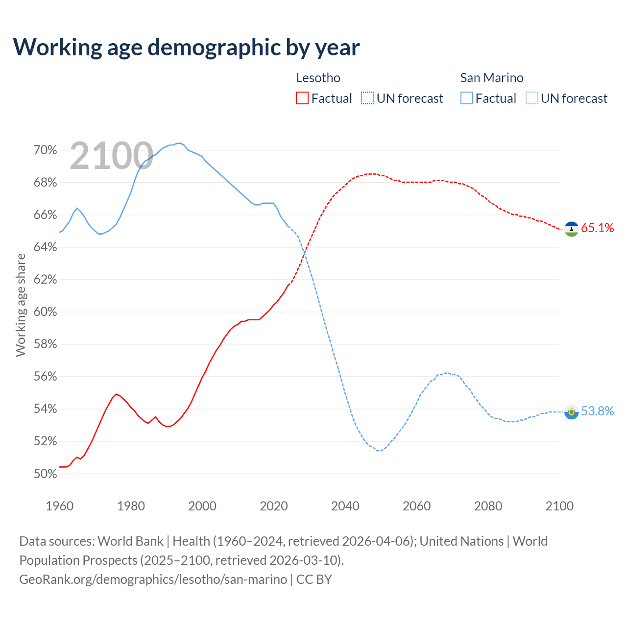 - Lesotho has 1.48M working age adults (aged 15-64) vs 22.2K in San Marino.