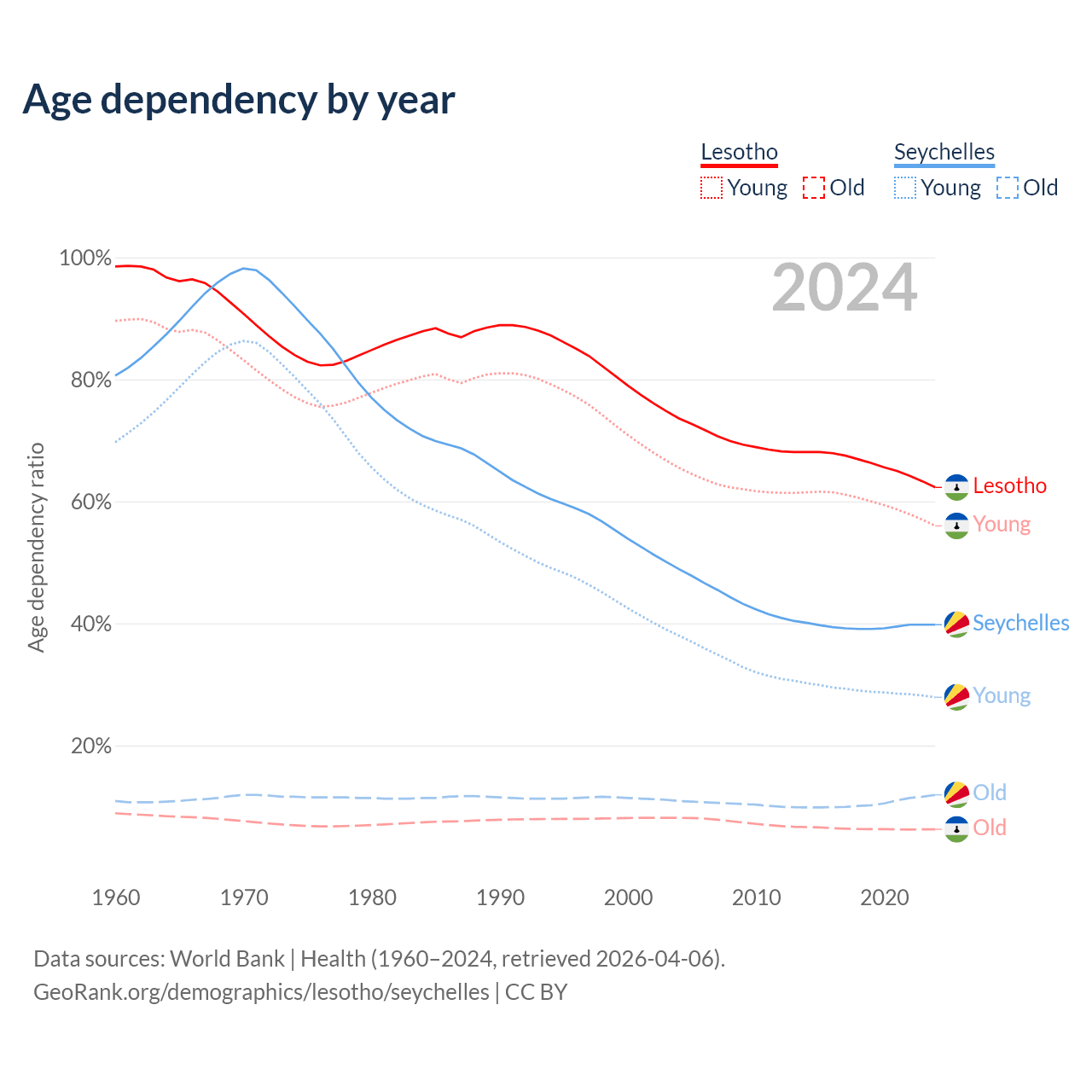 - Lesotho is ranked 143/196 by median age (oldest to youngest) vs 76/196 for the Seychelles.
