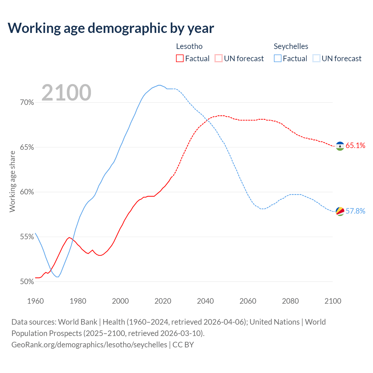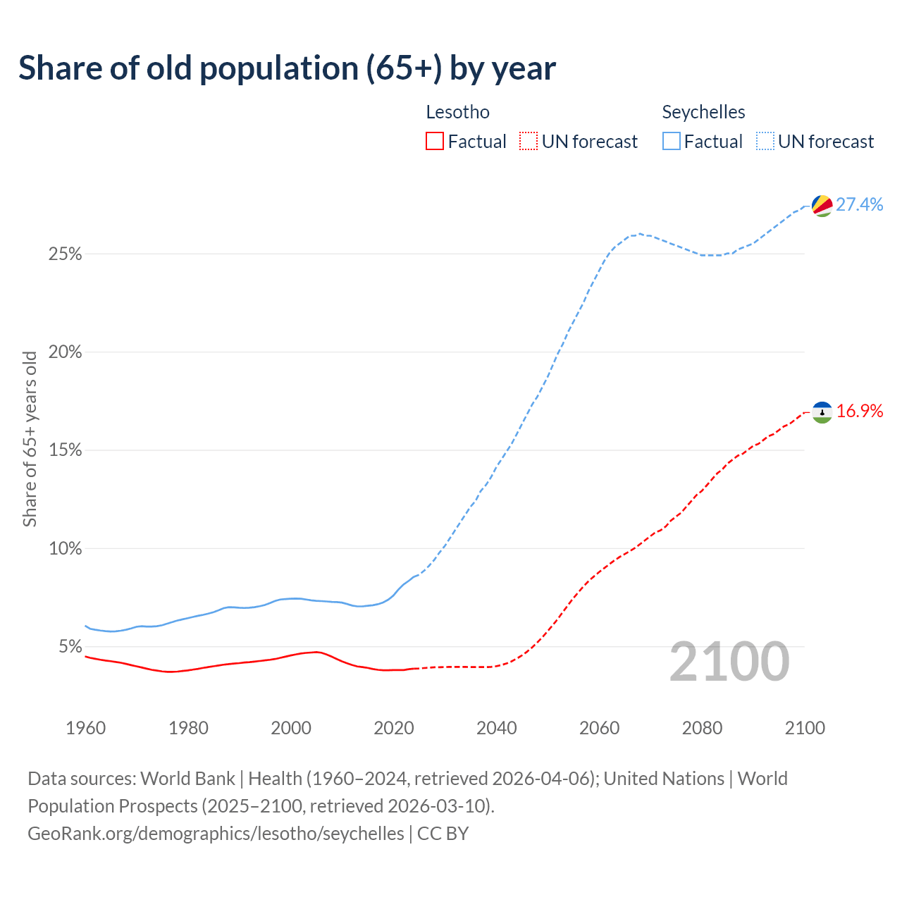 The share of older people aged 65 and over is 3.86% in Lesotho and 8.54% in the Seychelles. Life expectancy in Lesotho compared to the Seychelles .