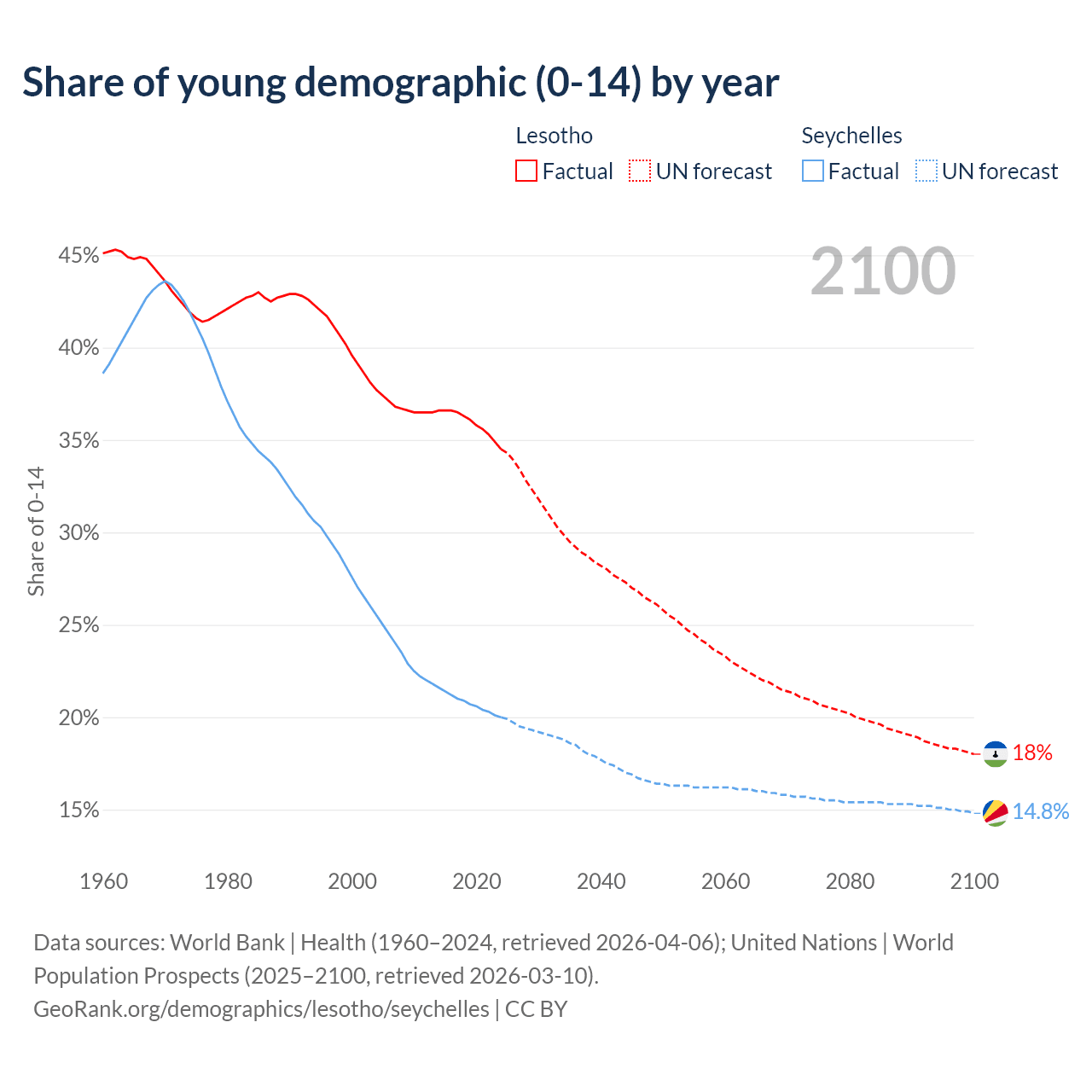 - The share of young demographic (0-15 years old) in Lesotho is 34.5% vs 20% in the Seychelles.