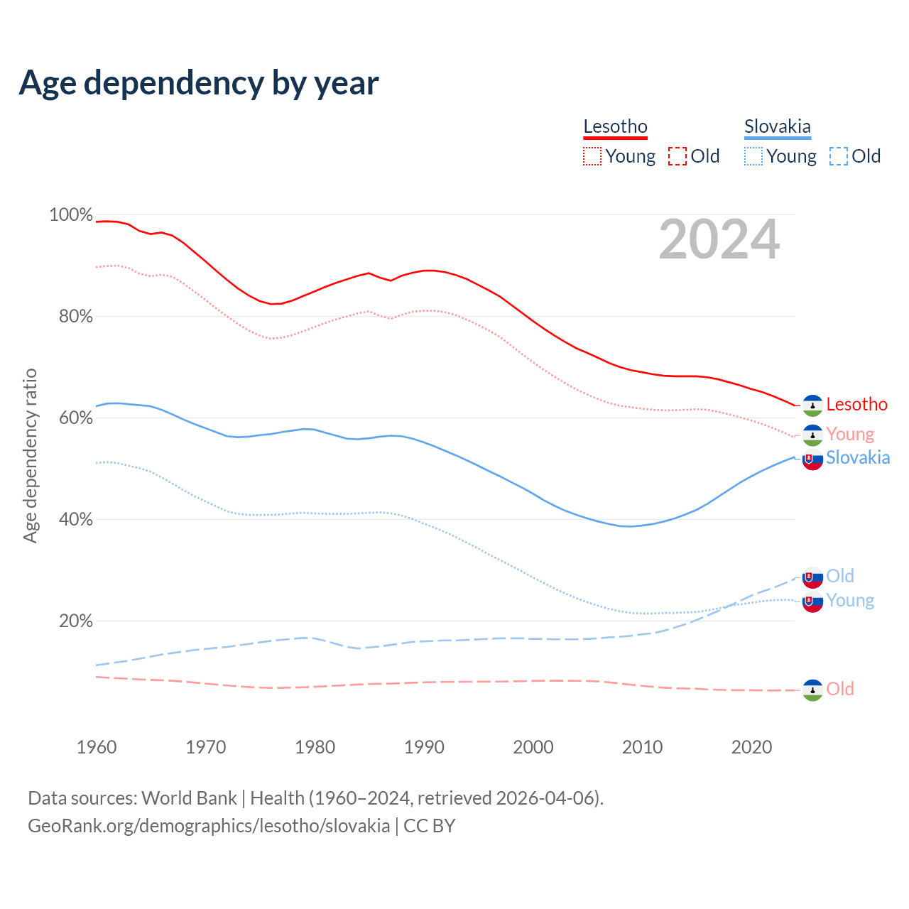 The share of older people aged 65 and over is 3.86% in Lesotho and 18.5% in Slovakia. Life expectancy in Lesotho compared to Slovakia .